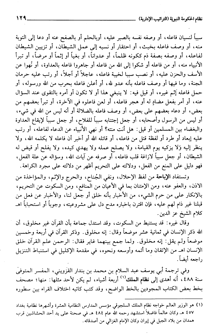 (1) هو الوزير العالم خواجه نظام الملك السلجوقي مؤسس المدارس النظامية العشرة وأشهرها نظامية بغداد 457 هـ وكان عالما فاضلا استشهد رحمه الله عام 484 هـ في صحنة على يد أحد الحشاشين قرب همدان من بلاد الجبل في إيران وكان الإمام الغزالي من أصدقائه.