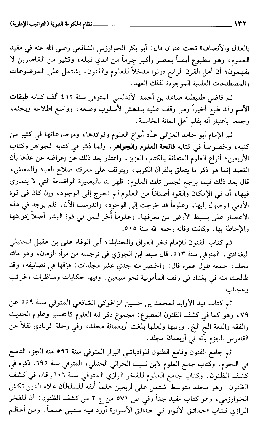 بالعدل والأنصاف» تحت عنوان قال: أبو بكر الخوارزمي الشافعي رضي الله عنه في مفيد العلوم، وهو مطبوع أيضا بمصر وأكبر جرما من الذي قبله، وكثير من القاصرين لا يفهمون؛ أن أهل القرن الرابع دونوا مدخلا للعلوم والفنون، يشتمل على الموضوعات والمصطلحات العلمية الموجودة لذلك العهد.