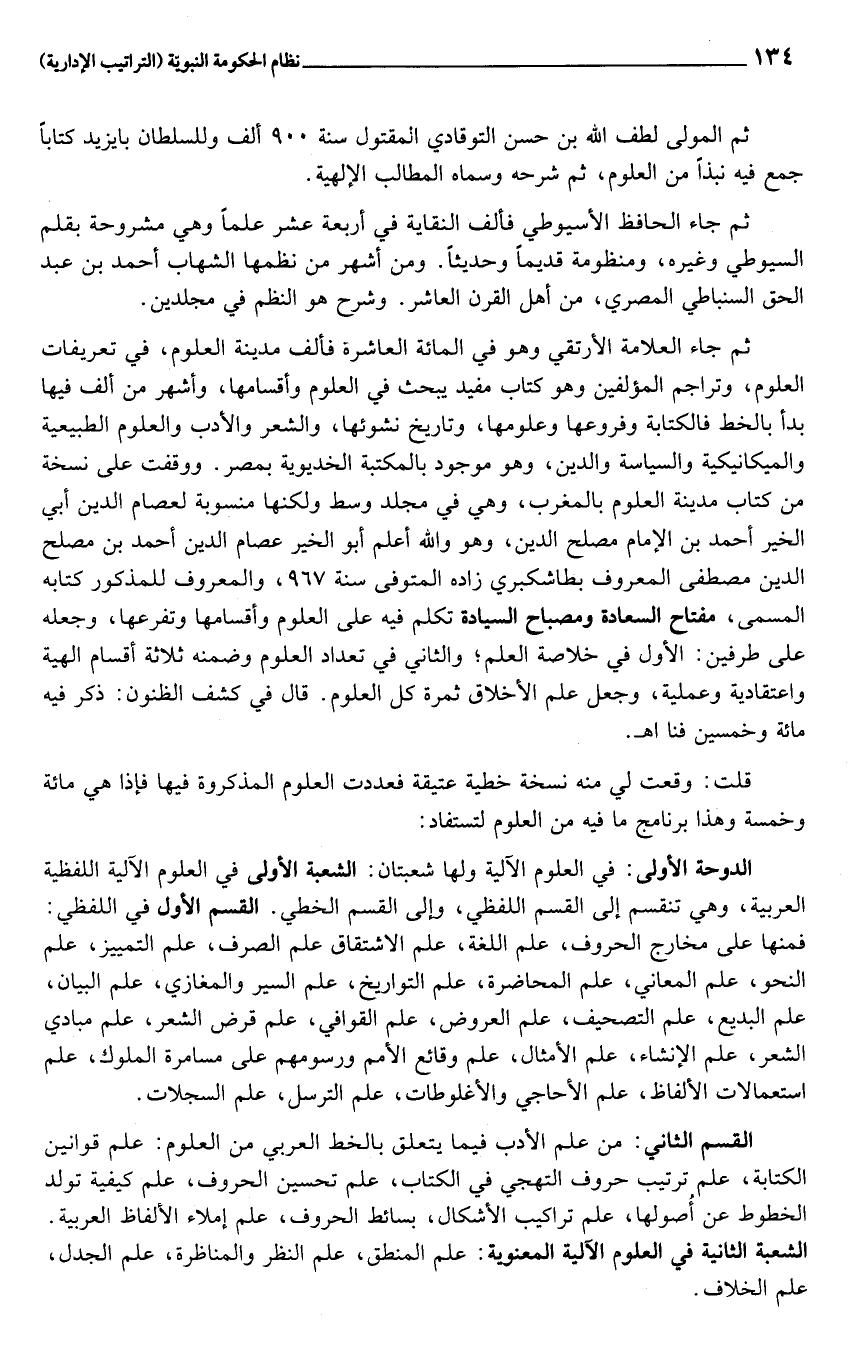 ثم جاء العلامة الأرتقي وهو في المائة العاشرة فألف مدينة العلوم، في تعريفات العلوم، وتراجم المؤلفين وهو كتاب مفيد يبحث في العلوم وأقسامها، وأشهر من ألف فيها بدأ بالخط فالكتابة وفروعها وعلومها، وتاريخ نشوئها، والشعر والأدب والعلوم الطبيعية والميكانيكية والسياسة والدين، وهو موجود بالمكتبة الخديوية بمصر. ووقفت على نسخة من كتاب مدينة العلوم بالمغرب، وهي في مجلد وسط ولكنها منسوبة لعصام الدين أبي الخير أحمد بن الإمام مصلح الدين، وهو والله أعلم أبو الخير عصام الدين أحمد بن مصلح الدين مصطفى المعروف بطاشكبري زاده المتوفى سنة 967، والمعروف للمذكور كتابه المسمى، مفتاح السعادة ومصباح السيادة تكلم فيه على العلوم وأقسامها وتفرعها، وجعله على طرفين: الأول في خلاصة العلم؛ والثاني في تعداد العلوم وضمنه ثلاثة أقسام الهية واعتقادية وعملية، وجعل علم الأخلاق ثمرة كل العلوم. قال في كشف الظنون: ذكر فيه مائة وخمسين فنا اهـ.
