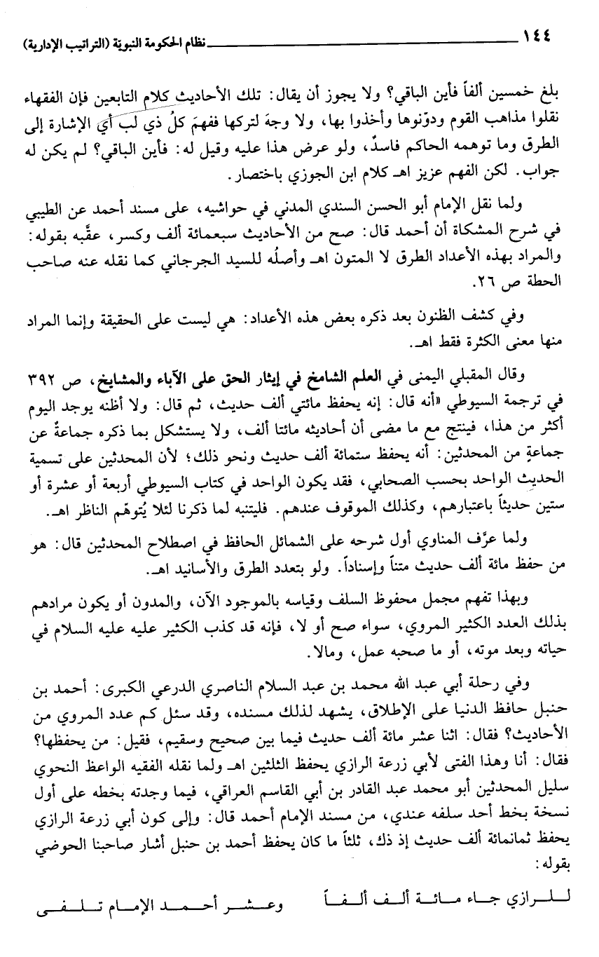 وقال المقبلي اليمنى في العلم الشامخ في إيثار الحق على الآباء والمشايخ، ص 392 في ترجمة السيوطي «أنه قال: إنه يحفظ مائتي ألف حديث، ثم قال: ولا أظنه يوجد اليوم أكثر من هذا، فينتج مع ما مضى أن أحاديثه مائتا ألف، ولا يستشكل بما ذكره جماعة عن جماعة من المحدثين: أنه يحفظ ستمائة ألف حديث ونحو ذلك؛ لأن المحدثين على تسمية الحديث الواحد بحسب الصحابي، فقد يكون الواحد في كتاب السيوطي أربعة أو عشرة أو ستين حديثا باعتبارهم، وكذلك الموقوف عندهم. فليتنبه لما ذكرنا لئلا يتوهّم الناظر اهـ.