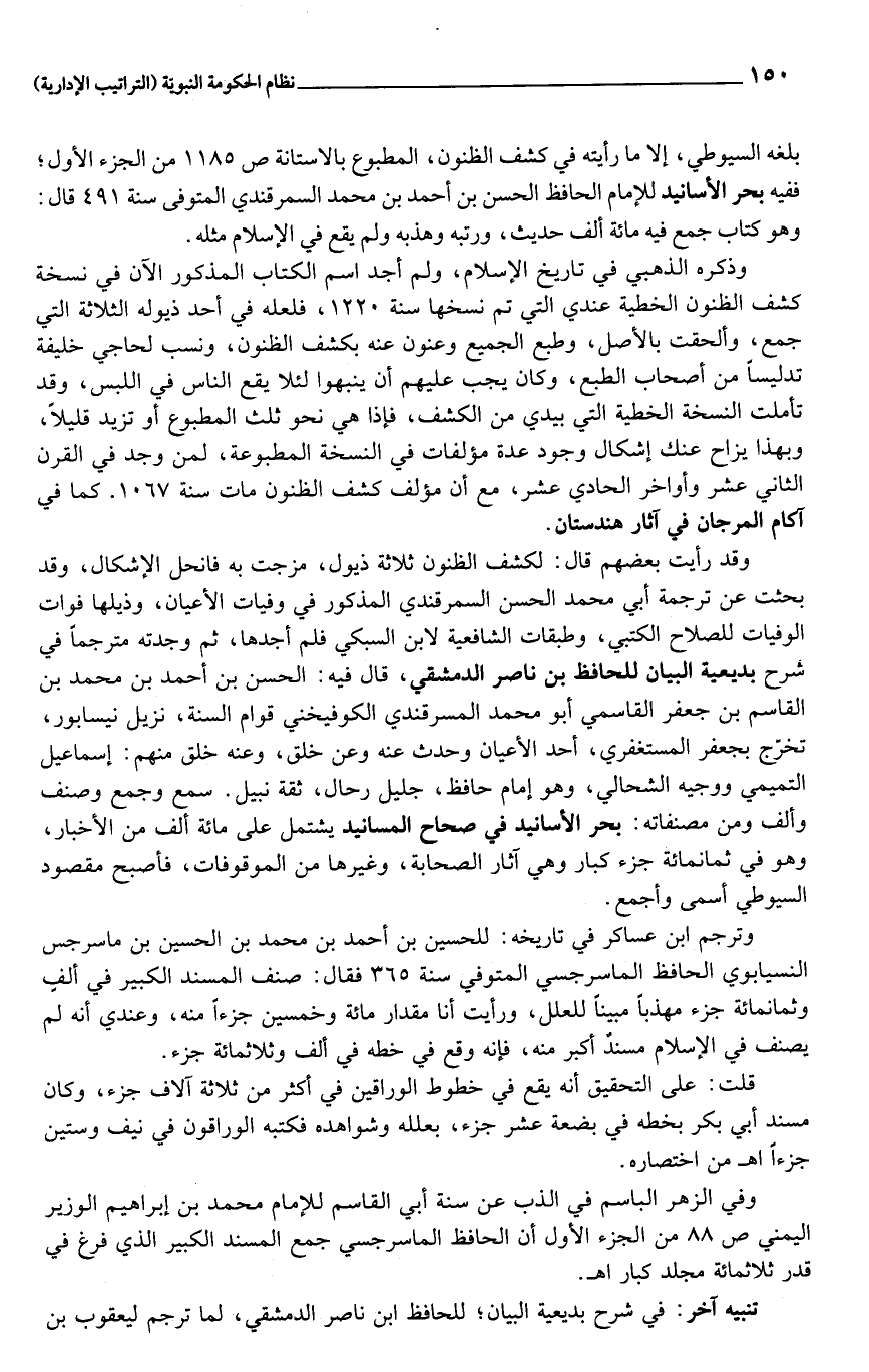 وقد رأيت بعضهم قال: لكشف الظنون ثلاثة ذيول، مزجت به فانحل الإشكال، وقد بحثت عن ترجمة أبي محمد الحسن السمرقندي المذكور في وفيات الأعيان، وذيلها فوات الوفيات للصلاح الكتبي، وطبقات الشافعية لابن السبكي فلم أجدها، ثم وجدته مترجما في شرح بديعية البيان للحافظ بن ناصر الدمشقي، قال فيه: الحسن بن أحمد بن محمد بن القاسم بن جعفر القاسمي أبو محمد المسرقندي الكوفيخني قوام السنة، نزيل نيسابور، تخرّج بجعفر المستغفري، أحد الأعيان وحدث عنه وعن خلق، وعنه خلق منهم: إسماعيل التميمي ووجيه الشحالي، وهو إمام حافظ، جليل رحال، ثقة نبيل. سمع وجمع وصنف وألف ومن مصنفاته: بحر الأسانيد في صحاح المسانيد يشتمل على مائة ألف من الأخبار، وهو في ثمانمائة جزء كبار وهي آثار الصحابة، وغيرها من الموقوفات، فأصبح مقصود السيوطي أسمى وأجمع.