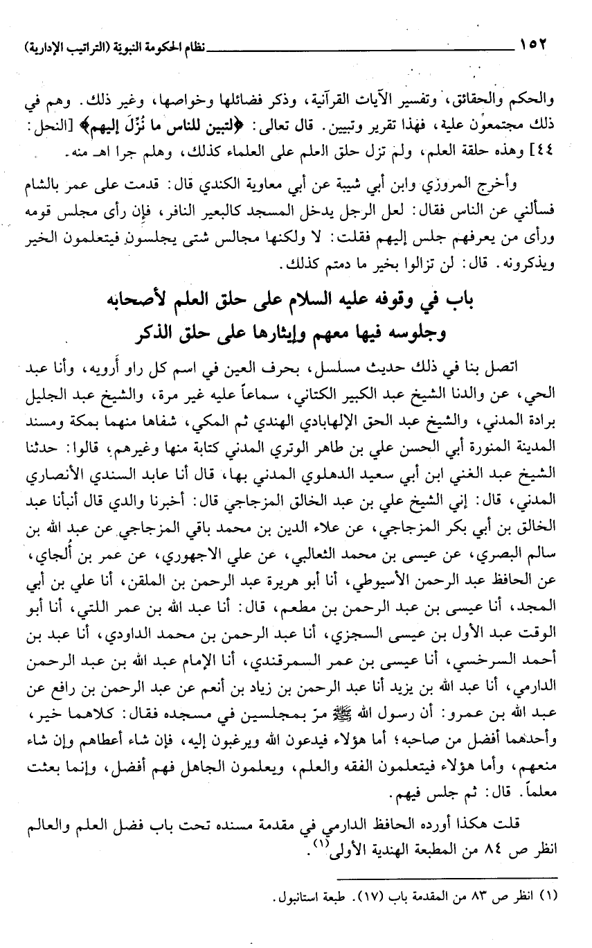 اتصل بنا في ذلك حديث مسلسل، بحرف العين في اسم كل راو أرويه، وأنا عبد الحي، عن والدنا الشيخ عبد الكبير الكتاني، سماعا عليه غير مرة، والشيخ عبد الجليل برادة المدني، والشيخ عبد الحق الإلهابادي الهندي ثم المكي، شفاها منهما بمكة ومسند المدينة المنورة أبي الحسن علي بن طاهر الوتري المدني كتابة منها وغيرهم، قالوا: حدثنا الشيخ عبد الغني ابن أبي سعيد الدهلوي المدني بها، قال أنا عابد السندي الأنصاري المدني، قال: إني الشيخ علي بن عبد الخالق المزجاجي قال: أخبرنا والدي قال أنبأنا عبد الخالق بن أبي بكر المزجاجي، عن علاء الدين بن محمد باقي المزجاجي عن عبد الله بن سالم البصري، عن عيسى بن محمد الثعالبي، عن علي الاجهوري، عن عمر بن ألجاي، عن الحافظ عبد الرحمن الأسيوطي، أنا أبو هريرة عبد الرحمن بن الملقن، أنا علي بن أبي المجد، أنا عيسى بن عبد الرحمن بن مطعم، قال: أنا عبد الله بن عمر اللتي، أنا أبو الوقت عبد الأول بن عيسى السجزي، أنا عبد الرحمن بن محمد الداودي، أنا عبد بن أحمد السرخسي، أنا عيسى بن عمر السمرقندي، أنا الإمام عبد الله بن عبد الرحمن الدارمي، أنا عبد الله بن يزيد أنا عبد الرحمن بن زياد بن أنعم عن عبد الرحمن بن رافع عن عبد الله بن عمرو: أن رسول الله صلى الله عليه وسلم مرّ بمجلسين في مسجده فقال: كلاهما خير، وأحدهما أفضل من صاحبه؛ أما هؤلاء فيدعون الله ويرغبون إليه، فإن شاء أعطاهم وإن شاء منعهم، وأما هؤلاء فيتعلمون الفقه والعلم، ويعلمون الجاهل فهم أفضل، وإنما بعثت معلما. قال: ثم جلس فيهم.