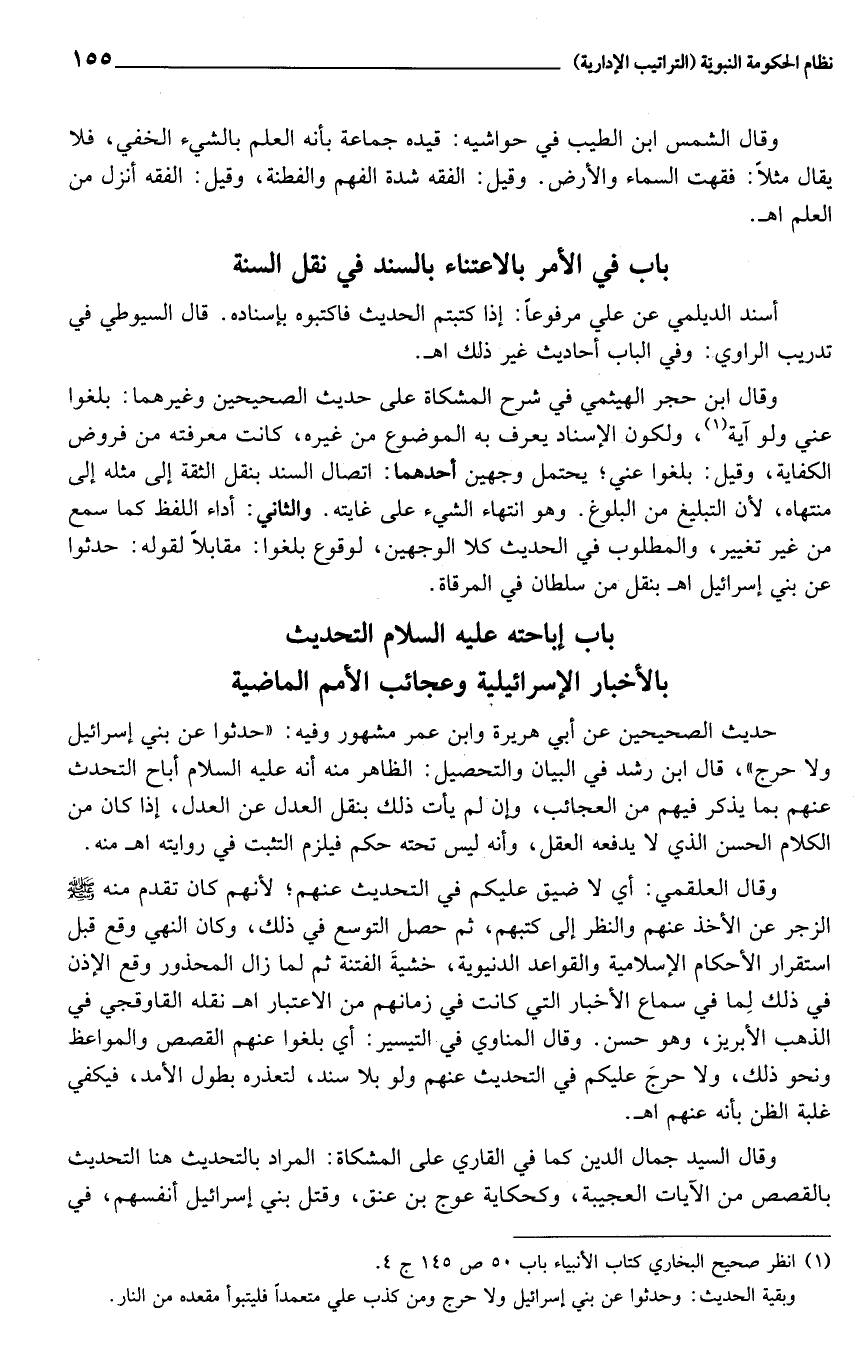 (1) انظر صحيح البخاري كتاب الأنبياء باب 50 ص 145 ج 4. وبقية الحديث: وحدثوا عن بني إسرائيل ولا حرج ومن كذب علي متعمدا فليتبوأ مقعده من النار.