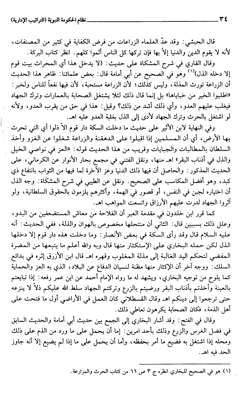 كما قرر ابن خالدون في مقدمة العبر أن الفلاحة من معاش المستضعفين من البدو، وعلل ذلك بسببين قال: الثاني أن منتحلها مخصوص بالهوان والذلة، ففي الحديث: أنه عليه السلام قال وقد رأى السكة في بعض الأنصار: وما دخلت هذه دار قوم إلا دخلها الذل لكن حمله البخاري على الإستكثار منها قال وبه والله أعلم ما يتبعها من المضرة المفضي لتحكم اليد الغالبة إلى مذلة المغلوب وقهره اهـ قال ابن الأزرق إثره في بدائع السلك: ووجه آخر أن الإكثار منها مظنة لنسيان الدفاع عن البلاد، الذي به العز والحماية كما يلوح من توجيه البخاري، ويشهد له ما رواه الإمام أحمد عن ابن عمر رفعه: إذا تبايعتم بالعينة وأخذتم بأذناب البقر ورضيتم بالزرع وتركتم الجهاد سلط الله عليكم ذلا لا ينزعه حتى ترجعوا إلى دينكم اهـ وقال القسطلاني كان العمل في الأراضي أول ما فتحت على أهل الذمة، فكان الصحابة يكرهون تعاطي ذلك.