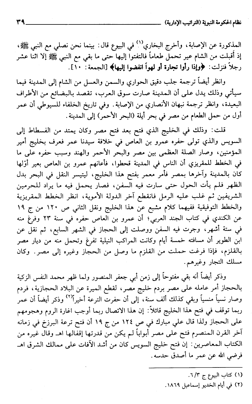 وذكر أيضا أنه بقي مفتوحا إلى زمن أبي جعفر المنصور ولما ظهر محمد النفس الزكية بالحجاز أمر عامله على مصر بردم خليج مصر، لقطع الميرة عن البلاد الحجازية، فردم وصار نسيا منسيا وبقي كذلك ألف سنة، إلى أن حفرت الترعة أخيرا «2» وذكر أيضا أن عمر ربما توقف في فتح هذا الخليج قائلا: إن هذا الاتصال ربما أوجب اغارة الروم وهجومهم على الحجاز ولذا قال علي مبارك في ص 124 من ج 19 أن فتح ترعة البرزخ في زمانه آخر القرن المنصرم فتح على مصر أبوابا لم يكن من قدرتها إقفالها اهـ وقال غيره من الكتاب المعاصرين: إن فتح خليج السويس كان من أشد الآفات على ممالك الشرق اهـ فرضي الله عن عمر ما أصدق حدسه.