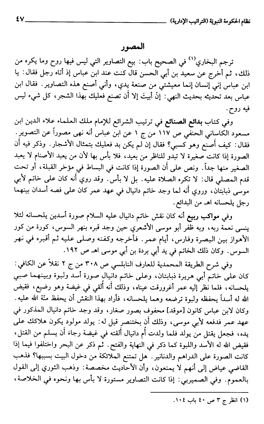 وكان لابن عباس كانون [موقد] محفوف بصور صغار، وقد وجد خاتم دانيال المذكور في عهد عمر فدفعه لأبي موسى، وذلك أن بختنصر قيل له: يولد مولود يكون هلاكك على يده، فجعل يقتل من يولد فلما ولدت أم دانيال ألقته في غيضة رجاء أن يسلم من القتل، فقيض الله له الأسد واللبوة كما ذكر في النهاية والفتح. ثم ذكر عن البحر واختلفوا فيما إذا كانت الصورة على الدراهم والدنانير. هل تمتنع الملائكة من دخول البيت بسببها؟ فذهب القاضي عياض إلى أنهم لا يمنعون، وأن الأحاديث مخصصة: وذهب الثوري إلى القول بالعموم. وفي الصميربي: إذا كانت التصاوير مستورة لا بأس بها ونحوه في الخلاصة،