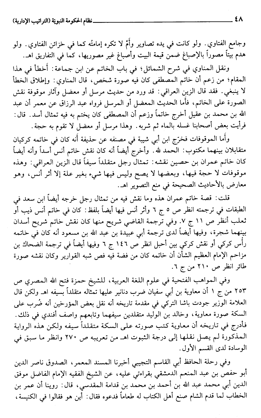 قلت: قصة خاتم عمران هذه وما نقش فيه من تمثال رجل خرجه أيضا ابن سعد في الطبقات في ترجمته انظر ص 5 ج 6 وأثر أنس فيها أيضا بلفظ: كان في خاتم أنس ذيب أو ثعلب أنظر ص 11 ج 7. وفي ترجمة القاضي شريح منها كان نقش خاتم شريح أسدان بينهما شجرة، وفيها أيضا لدى ترجمة أبي عبيدة بن عبد الله بن مسعود أنه كان في خاتمه رأس كركي أو نقش كركي بين أحبل انظر ص 146 ج 6 وفيها أيضا في ترجمة الضحاك بن مزاحم الإمام العظيم الشأن أن خاتمه كان من فضة فيه فص شبه القوارير وكان نقشه صورة طائر انظر ص 210 من ج 6.