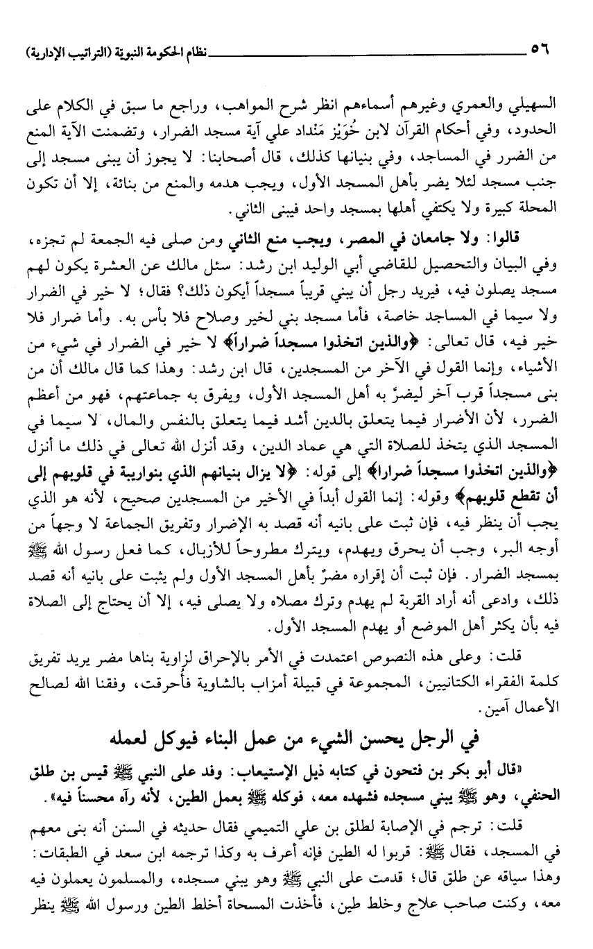 السهيلي والعمري وغيرهم أسماءهم انظر شرح المواهب، وراجع ما سبق في الكلام على الحدود، وفي أحكام القرآن لابن خويز منداد علي آية مسجد الضرار، وتضمنت الآية المنع من الضرر في المساجد، وفي بنيانها كذلك، قال أصحابنا: لا يجوز أن يا بنى مسجد إلى جنب مسجد لئلا يضر بأهل المسجد الأول، ويجب هدمه والمنع من بنائة، إلا أن تكون المحلة كبيرة ولا يكتفي أهلها بمسجد واحد فيا بنى الثاني.