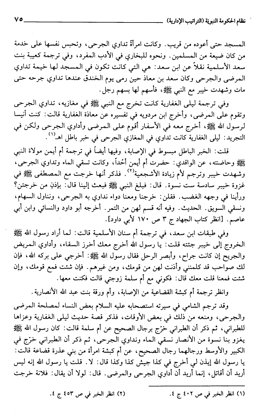 المسجد حتى أعوده من قريب. وكانت امرأة تداوي الجرحى، وتحبس نفسها على خدمة من كان ضيعة من المسلمين. ونحوه للبخاري في الأدب المفرد، وفي ترجمة كعيبة بنت سعد الأسلمية نقلا عن ابن سعد: هي التي كانت تكون في المسجد لها خيمة تداوي المرضى والجرحى وكان سعد بن معاذ حين رمى يوم الخندق عندها تداوي جرحه حتى مات وشهدت خيبر مع النبي صلى الله عليه وسلم، فأسهم لها بسهم رجل.
