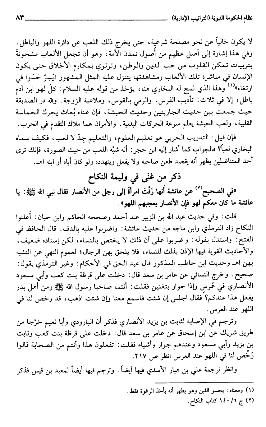 «في الصحيح «2» عن عائشة أنها زفّت امرأة إلى رجل من الأنصار فقال نبي الله صلى الله عليه وسلم: يا عائشة ما كان معكم لهو فإن الأنصار يعجبهم اللهو» .