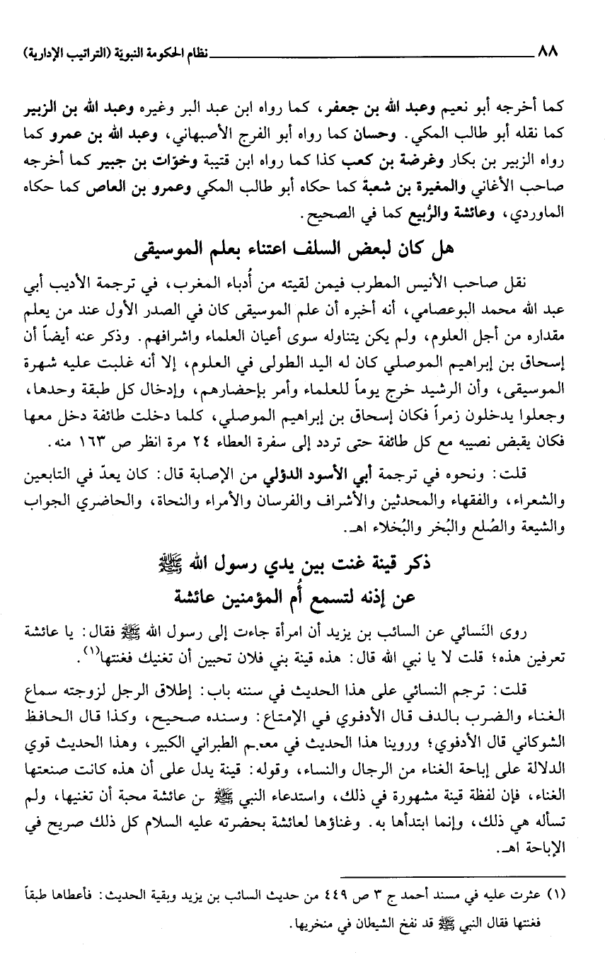 (1) عثرت عليه في مسند أحمد ج 3 ص 449 من حديث السائب بن يزيد وبقية الحديث: فأعطاها طبقا فغنتها فقال النبي صلى الله عليه وسلم قد نفخ الشيطان في منخريها.
