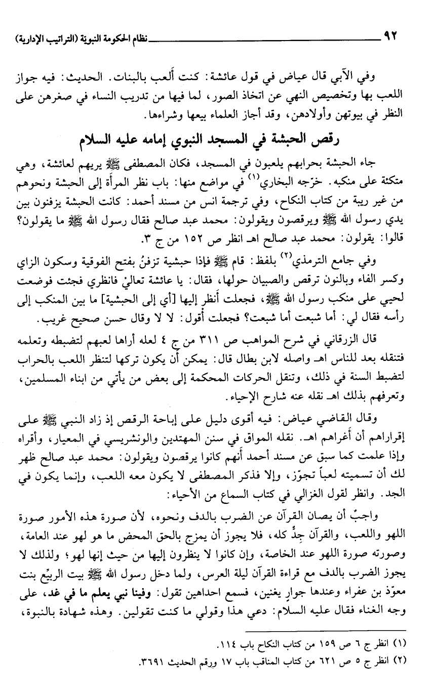 جاء الحبشة بحرابهم يلعبون في المسجد، فكان المصطفى صلى الله عليه وسلم يريهم لعائشة، وهي متكئة على منكبه. خرّجه البخاري «1» في مواضع منها: باب نظر المرأة إلى الحبشة ونحوهم من غير ريبة من كتاب النكاح، وفي ترجمة انس من مسند أحمد: كانت الحبشة يزفنون بين يدي رسول الله صلى الله عليه وسلم ويرقصون ويقولون: محمد عبد صالح فقال رسول الله صلى الله عليه وسلم ما يقولون؟