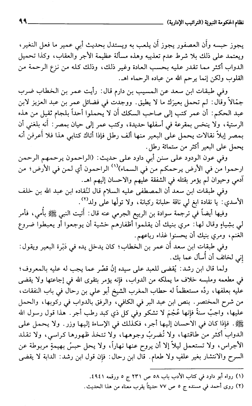 وفي طبقات ابن سعد عن المسيب بن دارم قال: رأيت عمر بن الخطاب ضرب جمّالا وقال: لم تحمل بعيرك ما لا يطيق. ووجدت في فضائل عمر بن عبد العزيز لابن عبد الحكم: أن عمر كتب إلى صاحب السكك أن لا يحملوا أحدا بلجام ثقيل من هذه الرستية، ولا ينخس بمقرعة في أسفلها حديدة، وكتب عمر إلى حيان بمصر: أنه بلغني أن بمصر إبلا نقالات يحمل على البعير منها ألف رطل فإذا أتاك كتابي هذا فلا أعرفن أنه يحمل على البعير أكثر من ستمائة رطل.