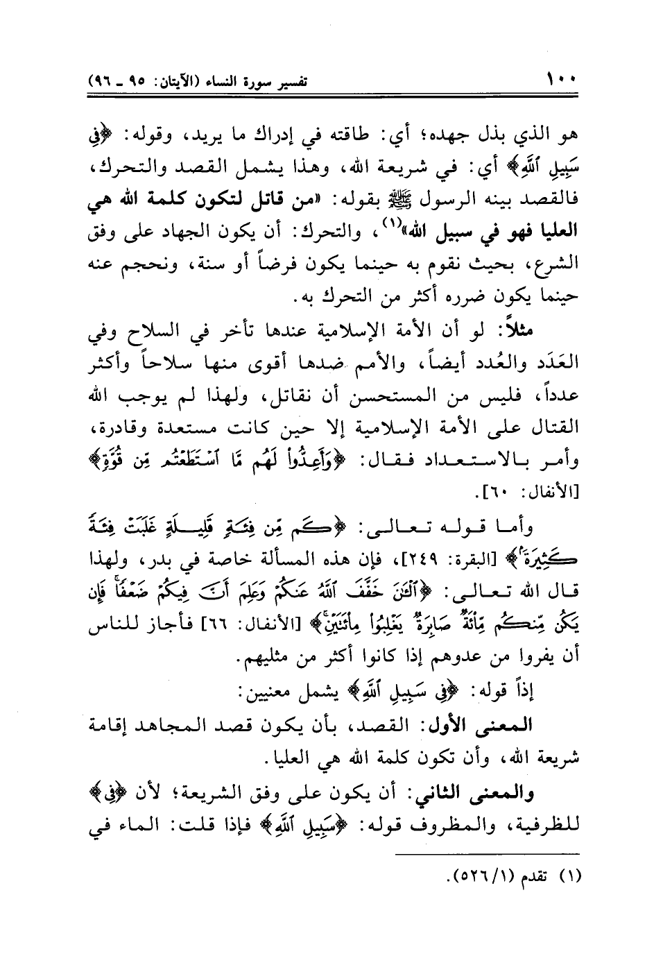 المعنى الأول: القصد، بأن يكون قصد المجاهد إقامة شريعة الله، وأن تكون كلمة الله هي العليا.