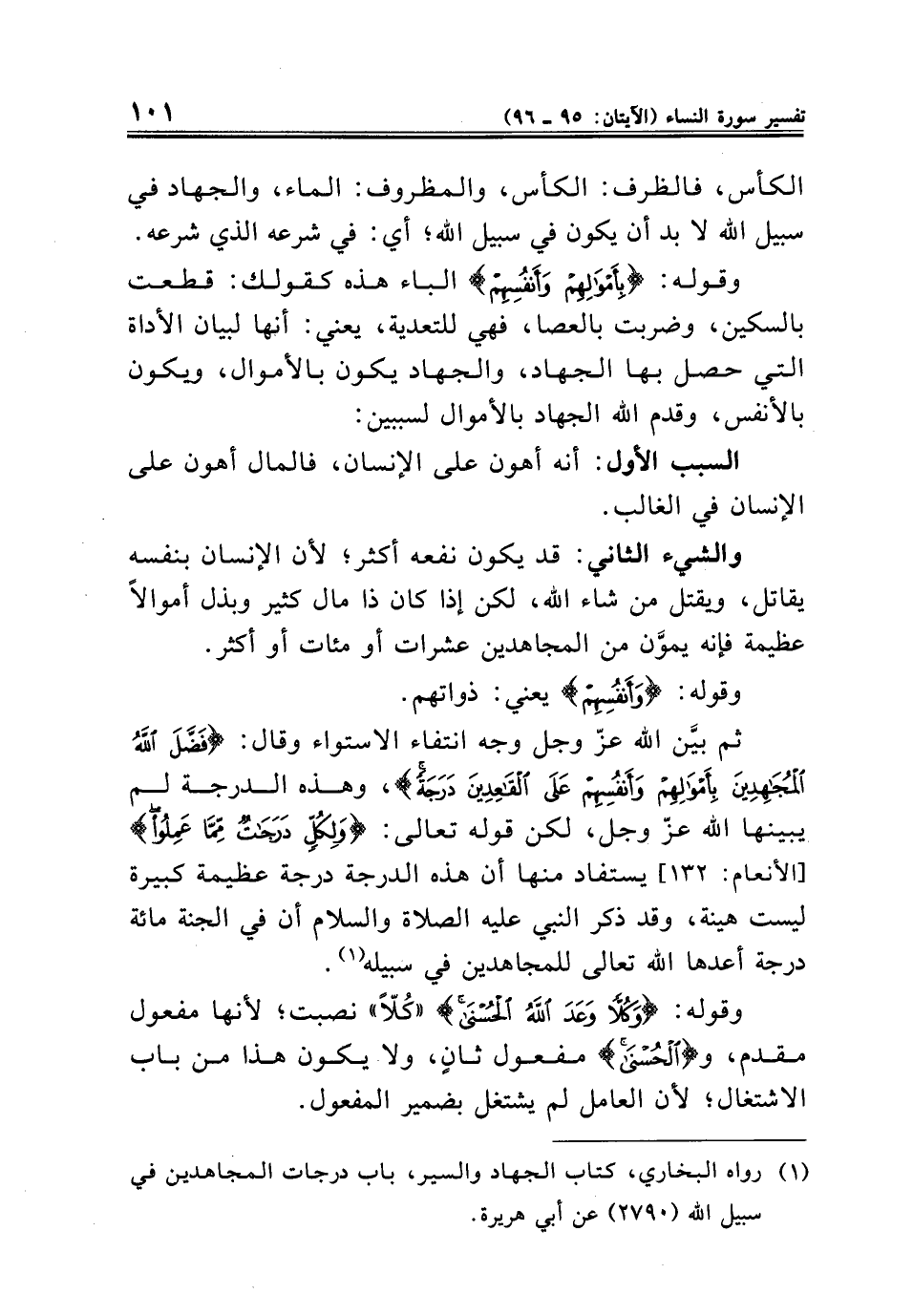 ثم بيَّن الله عزّ وجل وجه انتفاء الإستواء وقال: {فَضَّلَ اللَّهُ الْمُجَاهِدِينَ بِأَمْوَالِهِمْ وَأَنْفُسِهِمْ عَلَى الْقَاعِدِينَ دَرَجَةً}، وهذه الدرجة لم يبينها الله عزّ وجل، لكن قوله تعالى: {وَلِكُلٍّ دَرَجَاتٌ مِمَّا عَمِلُوا} [الأنعام: ١٣٢] يستفاد منها أن هذه الدرجة درجة عظيمة كبيرة ليست هينة، وقد ذكر النبي عليه الصلاة والسلام أن في الجنة مائة درجة أعدها الله تعالى للمجاهدين في سبيله (¬١).