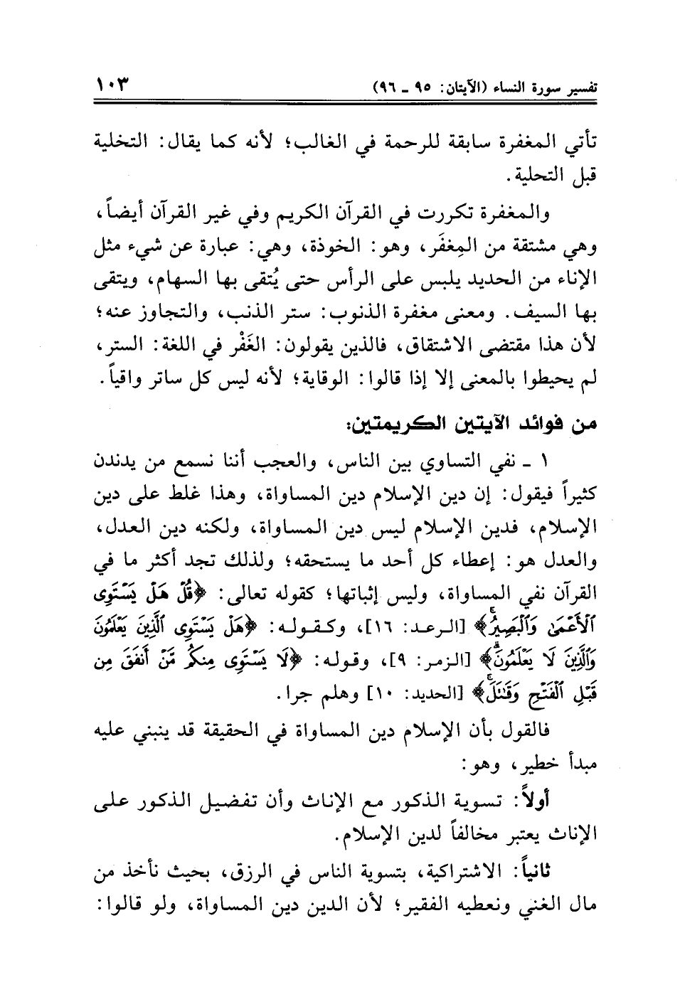 ١ - نفي التساوي بين الناس، والعجب أننا نسمع من يدندن كثيرًا فيقول: إن دين الإسلام دين المساواة، وهذا غلط على دين الإسلام، فدين الإسلام ليس دين المساواة، ولكنه دين العدل، والعدل هو: إعطاء كل أحد ما يستحقه؛ ولذلك تجد أكثر ما في القرآن نفي المساواة، وليس إثباتها؛ كقوله تعالى: {قُلْ هَلْ يَسْتَوِي الْأَعْمَى وَالْبَصِيرُ} [الرعد: ١٦]، وكقوله: {قُلْ هَلْ يَسْتَوِي الَّذِينَ يَعْلَمُونَ وَالَّذِينَ لَا يَعْلَمُونَ} [الزمر: ٩]، وقوله: {لَا يَسْتَوِي مِنْكُمْ مَنْ أَنْفَقَ مِنْ قَبْلِ الْفَتْحِ وَقَاتَلَ} [الحديد: ١٠] وهلم جرا.