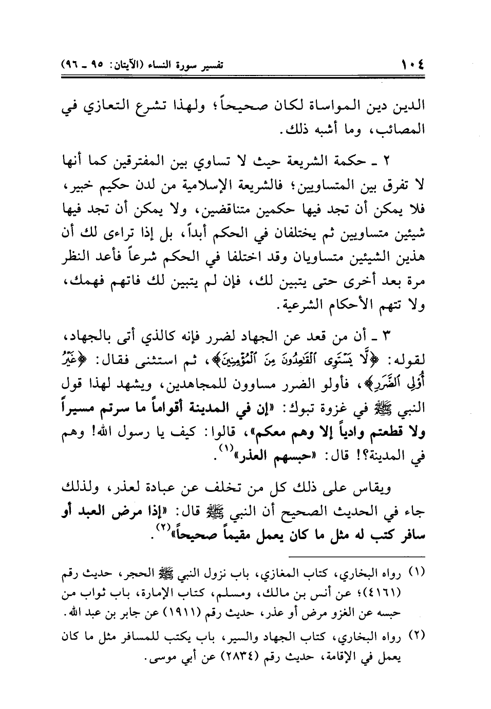 ٣ - أن من قعد عن الجهاد لضرر فإنه كالذي أتى بالجهاد، لقوله: {لَا يَسْتَوِي الْقَاعِدُونَ مِنَ الْمُؤْمِنِينَ}، ثم استثنى فقال: {غَيْرُ أُولِي الضَّرَرِ}، فأولو الضرر مساوون للمجاهدين، ويشهد لهذا قول النبي - صلى الله عليه وسلم - في غزوة تبوك: "إن في المدينة أقوامًا ما سرتم مسيرًا ولا قطعتم واديًا إلا وهم معكم"، قالوا: كيف يا رسول الله! وهم في المدينة؟ ! قال: "حبسهم العذر" (¬١).