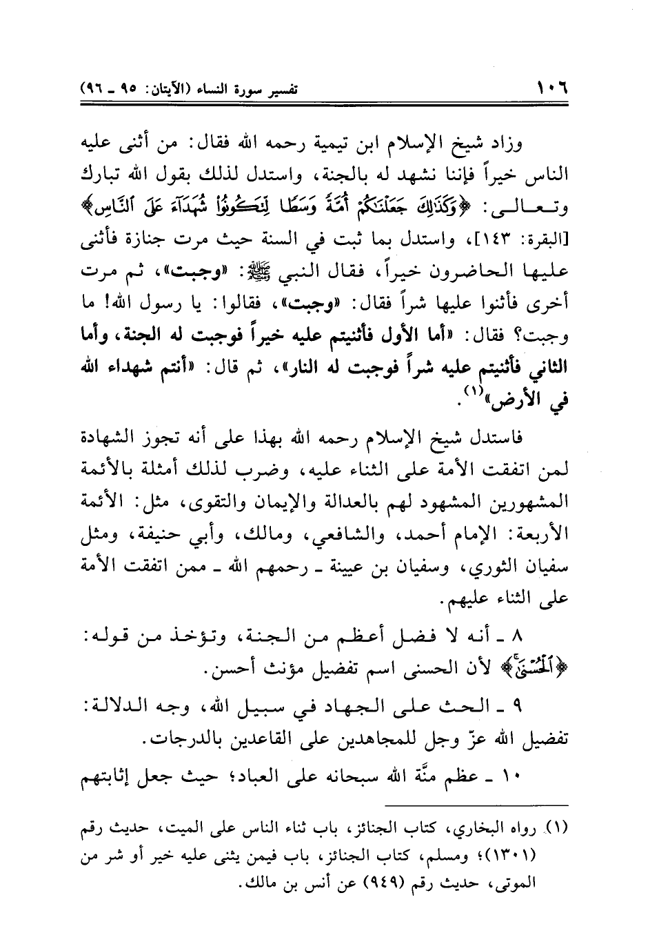 وزاد شيخ الإسلام ابن تيمية رحمه الله فقال: من أثنى عليه الناس خيرًا فإننا نشهد له بالجنة، واستدل لذلك بقول الله تبارك وتعالى: {وَكَذَلِكَ جَعَلْنَاكُمْ أُمَّةً وَسَطًا لِتَكُونُوا شُهَدَاءَ عَلَى النَّاسِ} [البقرة: ١٤٣]، واستدل بما ثبت في السنة حيث مرت جنازة فأثنى عليها الحاضرون خيرًا، فقال النبي - صلى الله عليه وسلم -: "وجبت"، ثم مرت أخرى فأثنوا عليها شرًا فقال: "وجبت"، فقالوا: يا رسول الله! ما وجبت؟ فقال: "أما الأول فأثنيتم عليه خيرًا فوجبت له الجنة، وأما الثاني فأثنيتم عليه شرًا فوجبت له النار"، ثم قال: "أنتم شهداء الله في الأرض" (¬١).