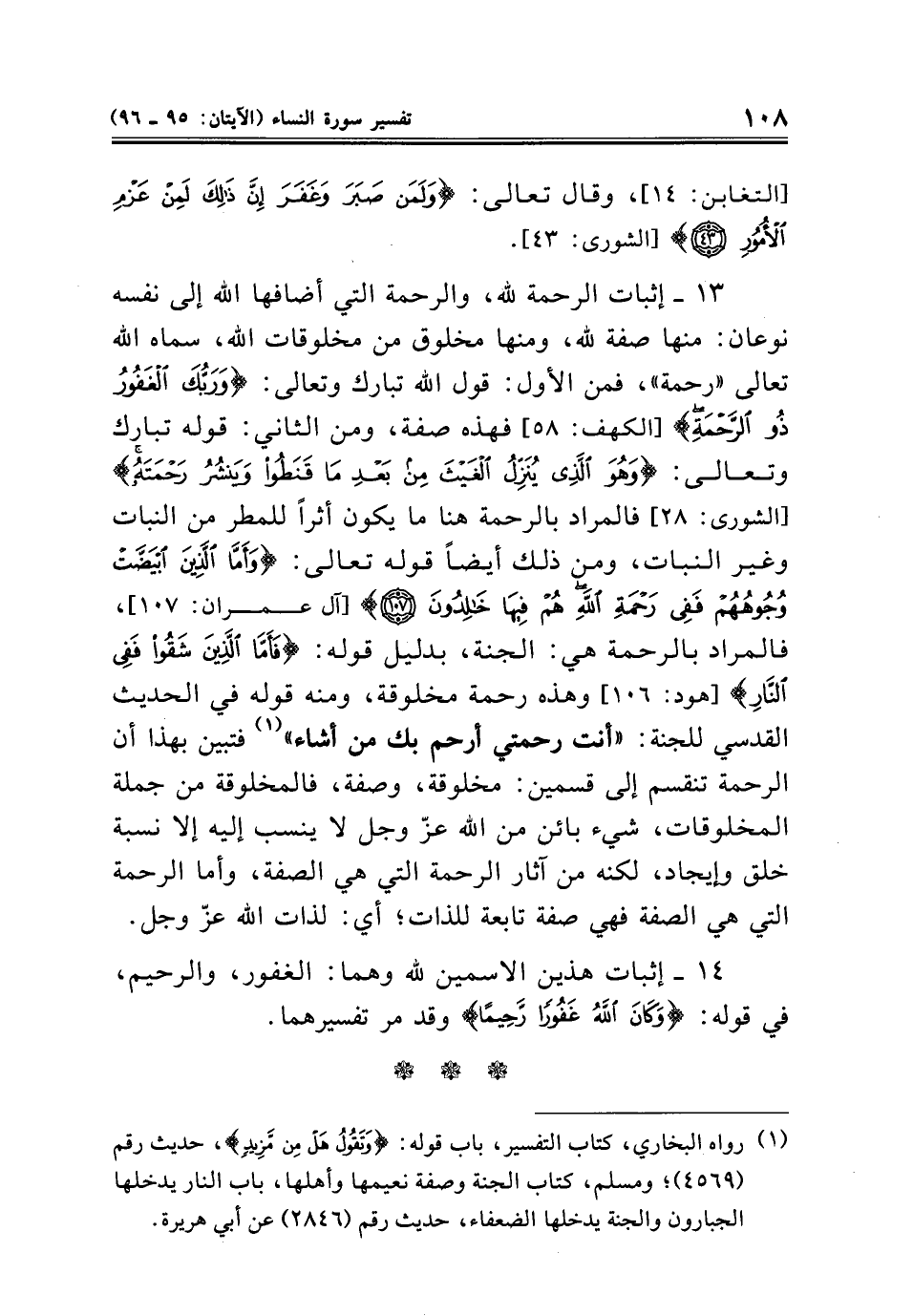 ١٣ - إثبات الرحمة لله، والرحمة التي أضافها الله إلى نفسه نوعان: منها صفة لله، ومنها مخلوق من مخلوقات الله، سماه الله تعالى "رحمة"، فمن الأول: قول الله تبارك وتعالى: {وَرَبُّكَ الْغَفُورُ ذُو الرَّحْمَةِ} [الكهف: ٥٨] فهذه صفة، ومن الثاني: قوله تبارك وتعالى: {وَهُوَ الَّذِي يُنَزِّلُ الْغَيْثَ مِنْ بَعْدِ مَا قَنَطُوا وَيَنْشُرُ رَحْمَتَهُ} [الشورى: ٢٨] فالمراد بالرحمة هنا ما يكون أثرًا للمطر من النبات وغير النبات، ومن ذلك أيضًا قوله تعالى: {وَأَمَّا الَّذِينَ ابْيَضَّتْ وُجُوهُهُمْ فَفِي رَحْمَةِ اللَّهِ هُمْ فِيهَا خَالِدُونَ (١٠٧)} [آل عمران: ١٠٧]، فالمراد بالرحمة هي: الجنة، بدليل قوله: {فَأَمَّا الَّذِينَ شَقُوا فَفِي النَّارِ} [هود: ١٠٦] وهذه رحمة مخلوقة، ومنه قوله في الحديث القدسي للجنة: "أنت رحمتي أرحم بك من أشاء" (¬١) فتبين بهذا أن الرحمة تنقسم إلى قسمين: مخلوقة، وصفة، فالمخلوقة من جملة المخلوقات، شيء بائن من الله عزّ وجل لا ينسب إليه إلا نسبة خلق وإيجاد، لكنه من آثار الرحمة التي هي الصفة، وأما الرحمة التي هي الصفة فهي صفة تابعة للذات؛ أي: لذات الله عزّ وجل.