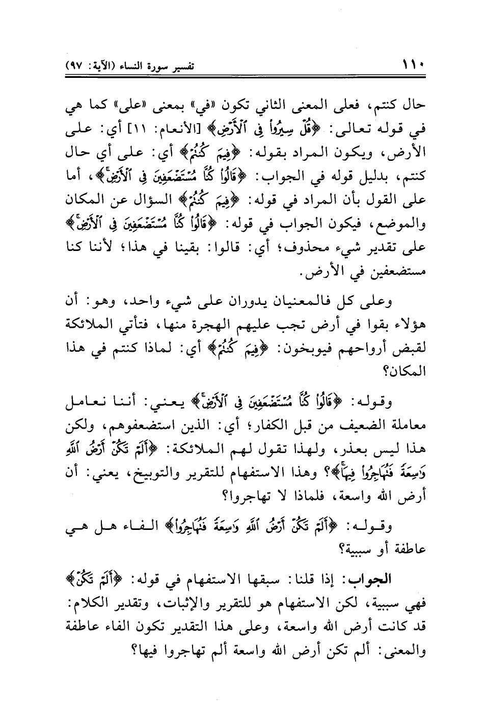 حال كنتم، فعلى المعنى الثاني تكون "في" بمعنى "على" كما هي في قوله تعالى: {قُلْ سِيرُوا فِي الْأَرْضِ} [الأنعام: ١١] أي: على الأرض، ويكون المراد بقوله: {فِيمَ كُنْتُمْ} أي: على أي حال كنتم، بدليل قوله في الجواب: {قَالُوا كُنَّا مُسْتَضْعَفِينَ فِي الْأَرْضِ}، أما على القول بأن المراد في قوله: {فِيمَ كُنْتُمْ} السؤال عن المكان والموضع، فيكون الجواب في قوله: {قَالُوا كُنَّا مُسْتَضْعَفِينَ فِي الْأَرْضِ} على تقدير شيء محذوف؛ أي: قالوا: بقينا في هذا؛ لأننا كنا مستضعفين في الأرض.