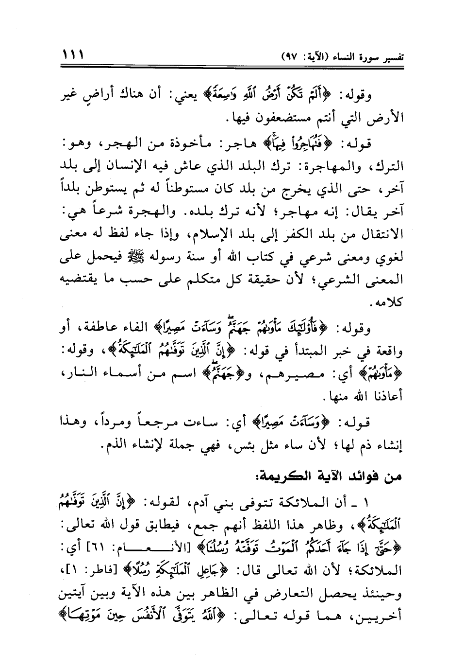 وقوله: {أَلَمْ تَكُنْ أَرْضُ اللَّهِ وَاسِعَةً} يعني: أن هناك أراضٍ غير الأرض التي أنتم مستضعفون فيها.