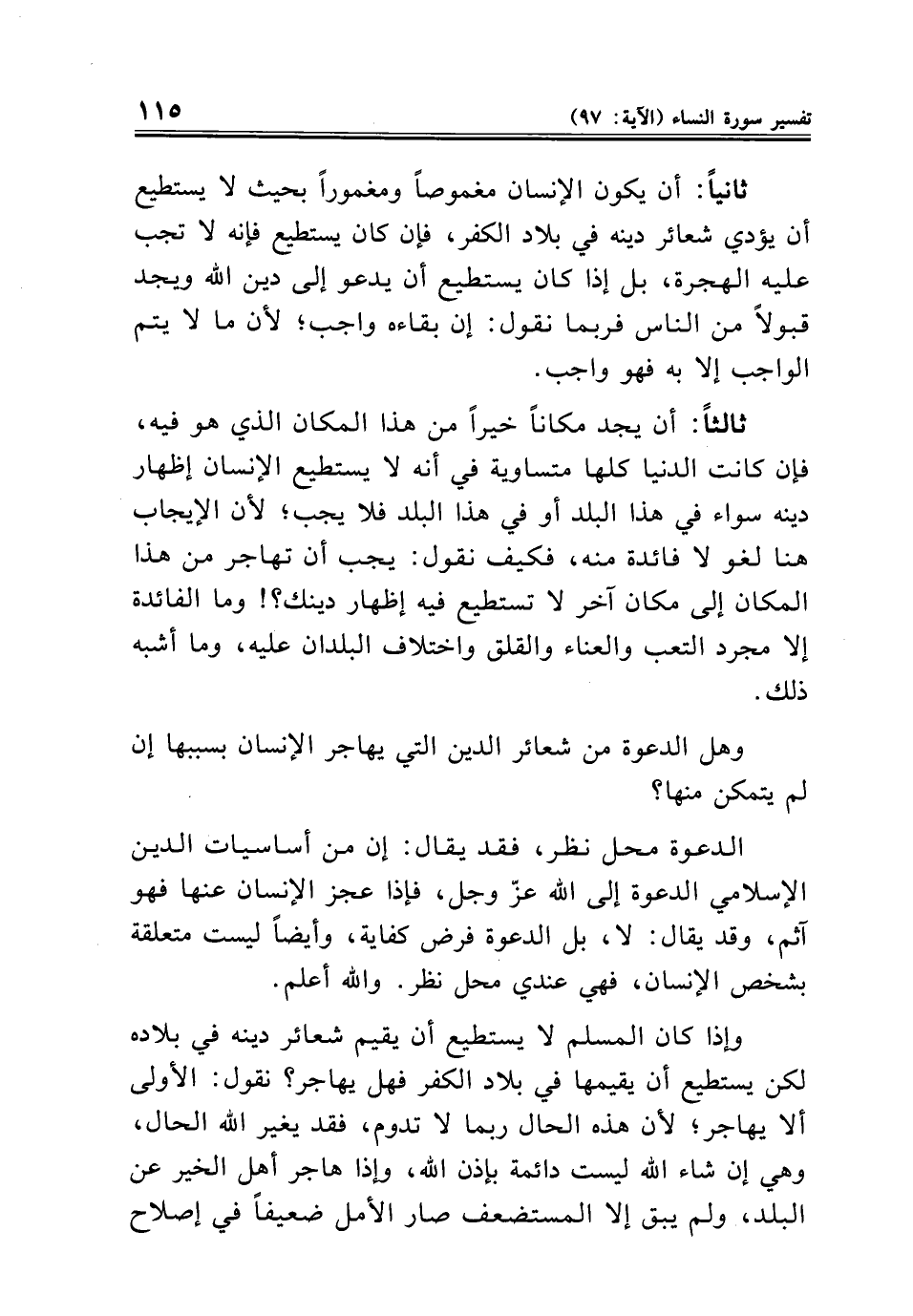 ثالثًا: أن يجد مكانًا خيرًا من هذا المكان الذي هو فيه، فإن كانت الدنيا كلها متساوية في أنه لا يستطيع الإنسان إظهار دينه سواء في هذا البلد أو في هذا البلد فلا يجب؛ لأن الإيجاب هنا لغو لا فائدة منه، فكيف نقول: يجب أن تهاجر من هذا المكان إلى مكان آخر لا تستطيع فيه إظهار دينك؟ ! وما الفائدة إلا مجرد التعب والعناء والقلق واختلاف البلدان عليه، وما أشبه ذلك.