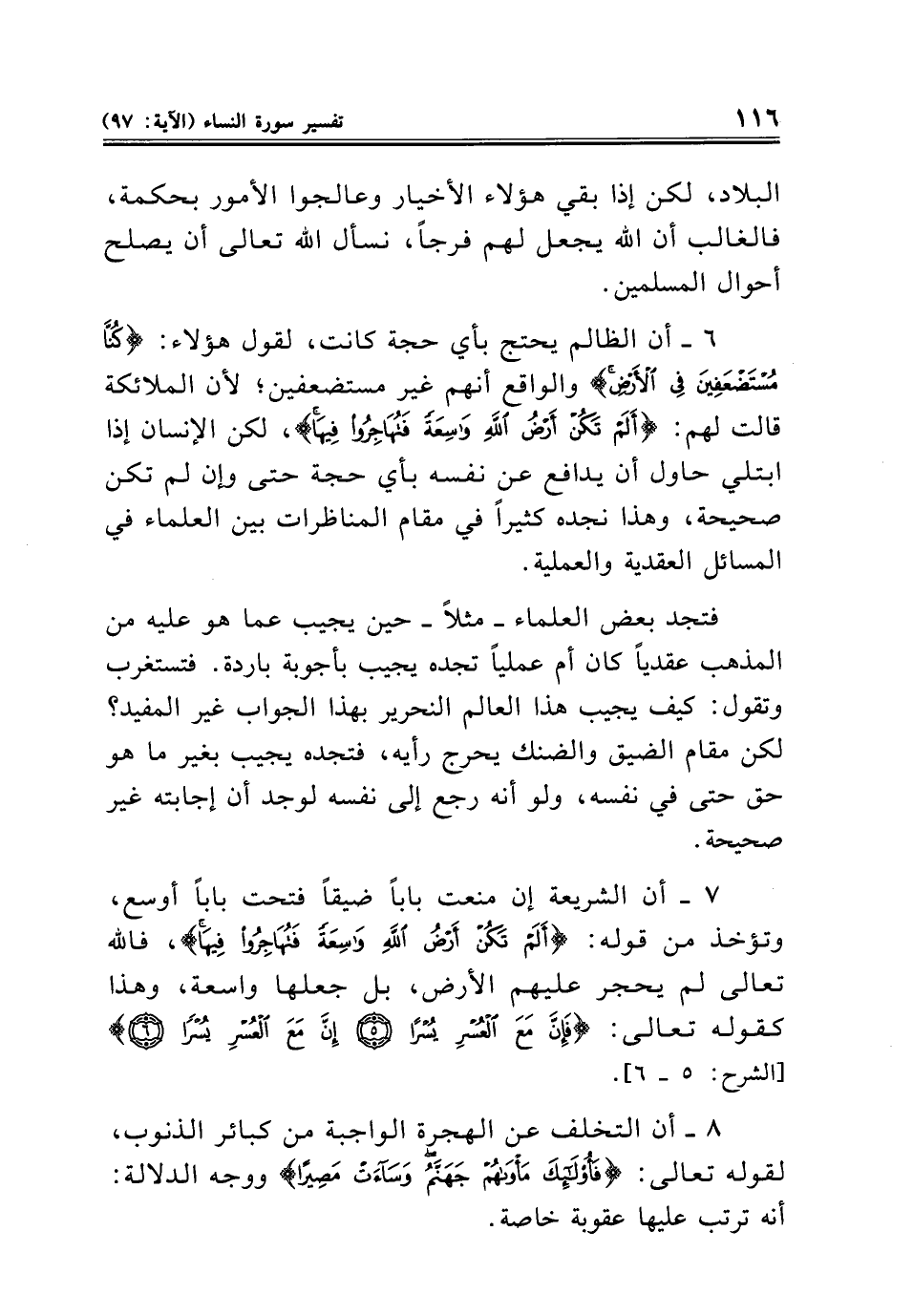 ٧ - أن الشريعة إن منعت بابًا ضيقًا فتحت بابًا أوسع، وتؤخذ من قوله: {أَلَمْ تَكُنْ أَرْضُ اللَّهِ وَاسِعَةً فَتُهَاجِرُوا فِيهَا}، فالله تعالى لم يحجر عليهم الأرض، بل جعلها واسعة، وهذا كقوله تعالى: {فَإِنَّ مَعَ الْعُسْرِ يُسْرًا (٥) إِنَّ مَعَ الْعُسْرِ يُسْرًا (٦)} [الشرح: ٥ - ٦].