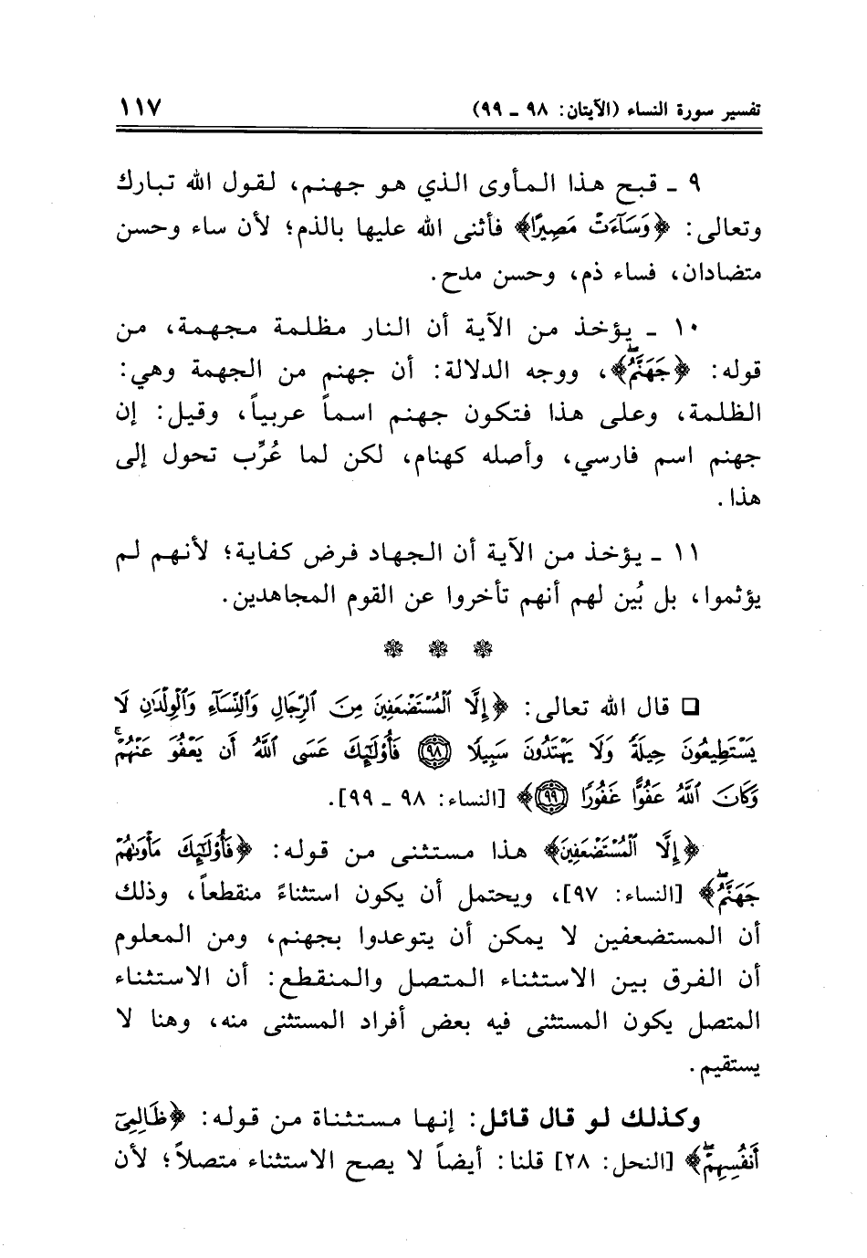 {إِلَّا الْمُسْتَضْعَفِينَ} هذا مستثنى من قوله: {فَأُولَئِكَ مَأْوَاهُمْ جَهَنَّمُ} [النساء: ٩٧]، ويحتمل أن يكون استثناءً منقطعًا، وذلك أن المستضعفين لا يمكن أن يتوعدوا بجهنم، ومن المعلوم أن الفرق بين الإستثناء المتصل والمنقطع: أن الإستثناء المتصل يكون المستثنى فيه بعض أفراد المستثنى منه، وهنا لا يستقيم.