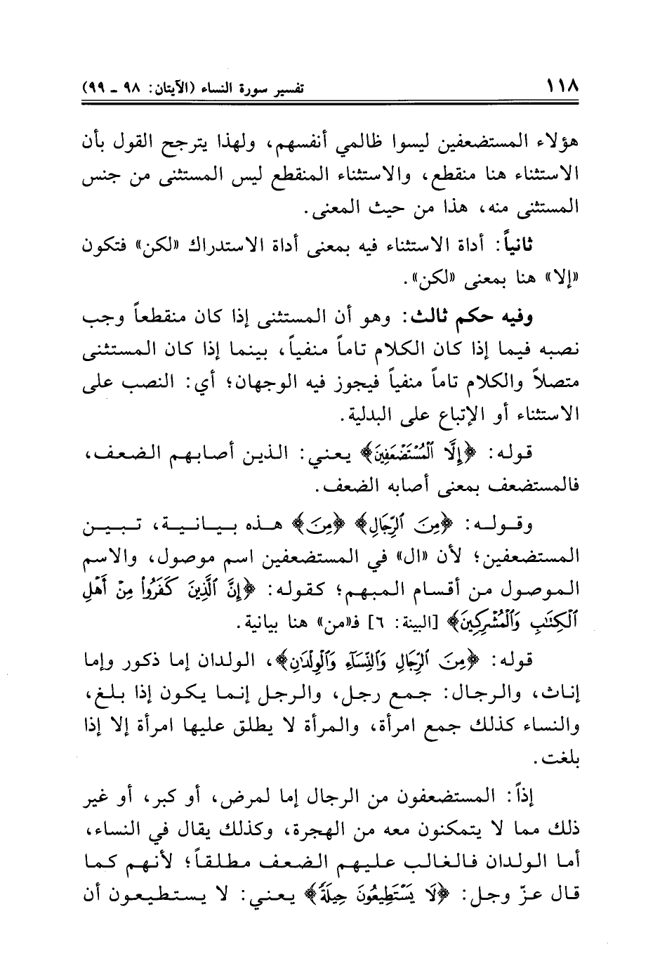 قوله: {إِلَّا الْمُسْتَضْعَفِينَ} يعني: الذين أصابهم الضعف، فالمستضعف بمعنى أصابه الضعف.