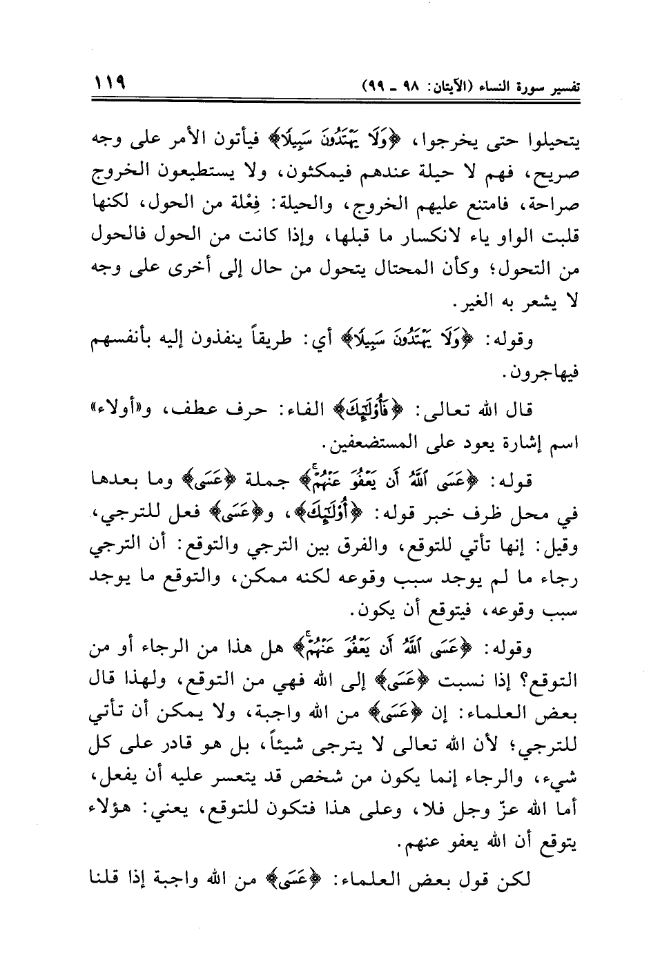 وقوله: {عَسَى اللَّهُ أَنْ يَعْفُوَ عَنْهُمْ} هل هذا من الرجاء أو من التوقع؟ إذا نسبت {عَسَى} إلى الله فهي من التوقع، ولهذا قال بعض العلماء: إن {عَسَى} من الله واجبة، ولا يمكن أن تأتي للترجي؛ لأن الله تعالى لا يترجى شيئًا، بل هو قادر على كل شيء، والرجاء إنما يكون من شخص قد يتعسر عليه أن يفعل، أما الله عزّ وجل فلا، وعلى هذا فتكون للتوقع، يعني: هؤلاء يتوقع أن الله يعفو عنهم.