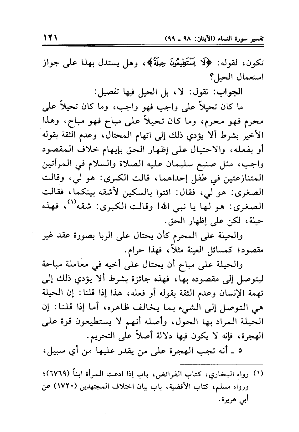 والحيلة على مباح أن يحتال على أخيه في معاملة مباحة ليتوصل إلى مقصوده بها، فهذه جائزة بشرط ألا يؤدي ذلك إلى تهمة الإنسان وعدم الثقة بقوله أو فعله، هذا إذا قلنا: إن الحيلة هي التوصل إلى الشيء بما يخالف ظاهره، أما إذا قلنا: إن الحيلة المراد بها الحول، وأصله أنهم لا يستطيعون قوة على الهجرة، فإنه لا يكون فيها دلالة أصلًا على التحريم.