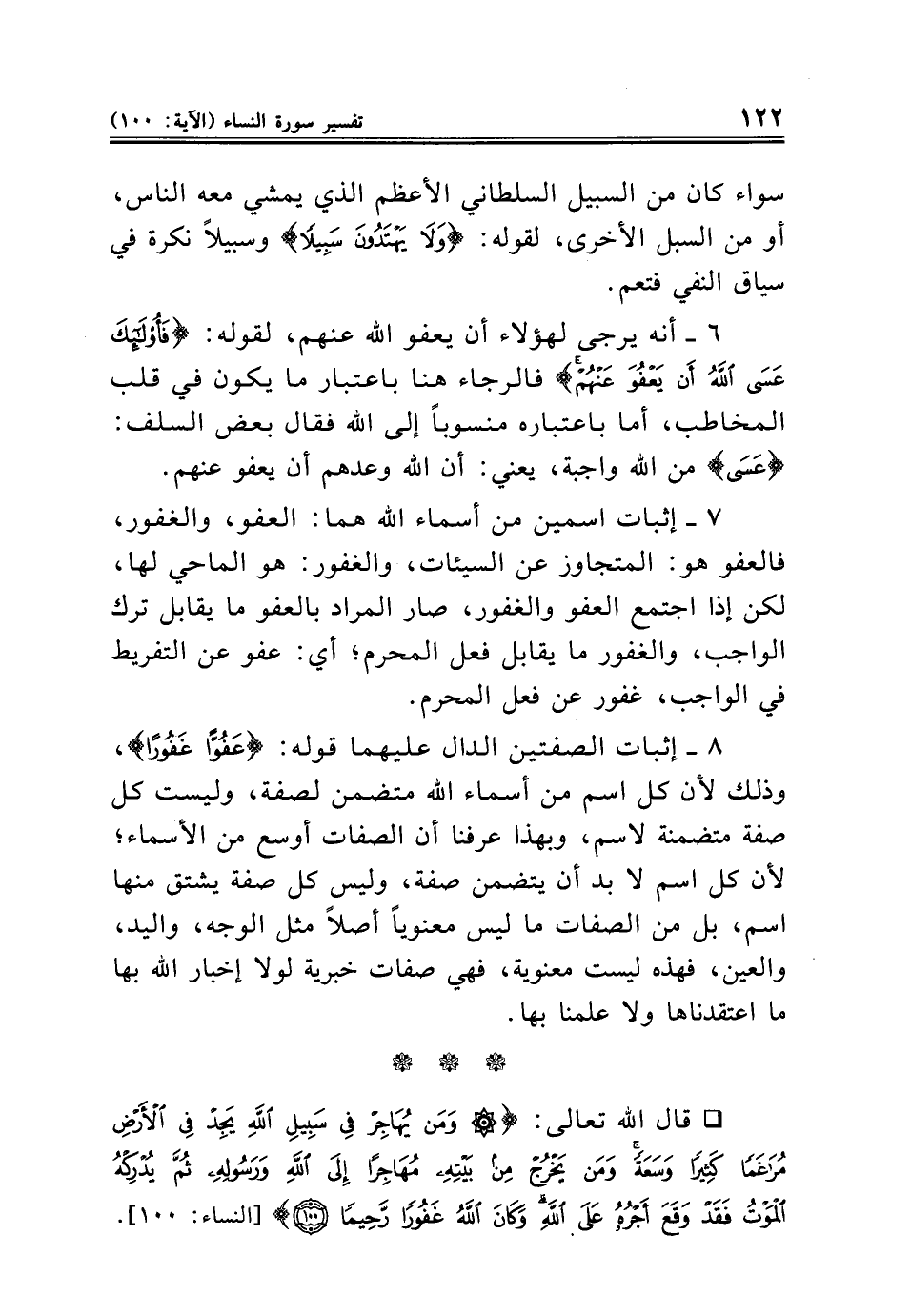 ٦ - أنه يرجى لهؤلاء أن يعفو الله عنهم، لقوله: {فَأُولَئِكَ عَسَى اللَّهُ أَنْ يَعْفُوَ عَنْهُمْ} فالرجاء هنا باعتبار ما يكون في قلب المخاطب، أما باعتباره منسوبًا إلى الله فقال بعض السلف: {عَسَى} من الله واجبة، يعني: أن الله وعدهم أن يعفو عنهم.