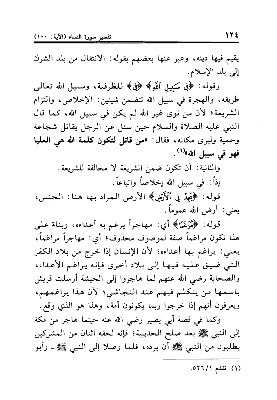 قوله: {مُرَاغَمًا} أي: مهاجرًا يرغم به أعداءه، وبناءً على هذا تكون مراغمًا صفة لموصوف محذوف؛ أي: مهاجرًا مراغمًا، يعني: يراغم بها أعداءه؛ لأن الإنسان إذا خرج من بلاد الكفر التي ضيق عليه فيها إلى بلاد أخرى فإنه يراغم الأعداء، والصحابة رضي الله عنهم لما هاجروا إلى الحبشة أرسلت قريش باسمها من يتكلم فيهم عند النجاشي؛ لأن هذا يراغمهم، ويعرفون أنهم إذا خرجوا ربما يكونون أمة، وهذا هو الذي وقع.
