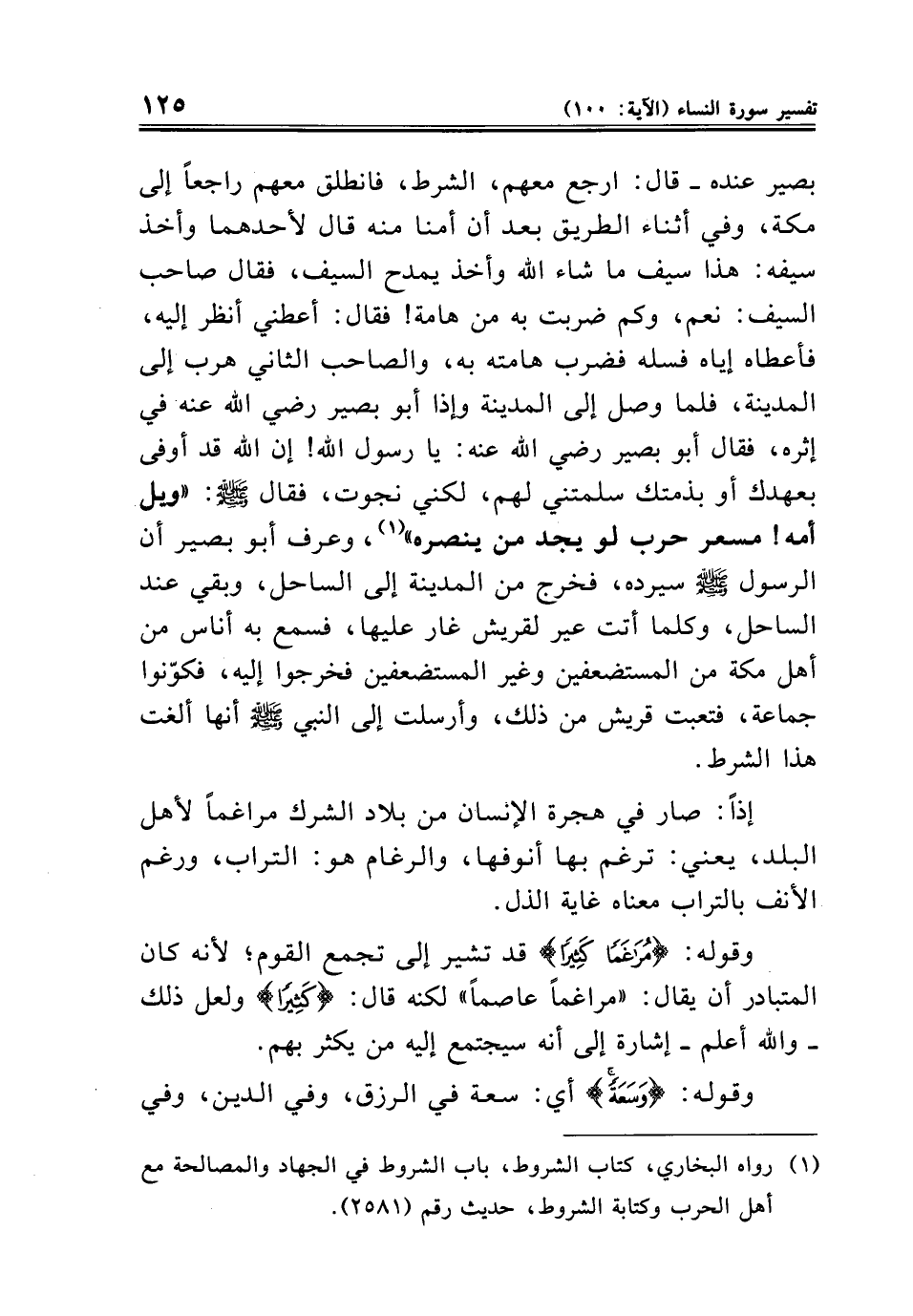 (¬١) رواه البخاري، كتاب الشروط، باب الشروط في الجهاد والمصالحة مع أهل الحرب وكتابة الشروط، حديث رقم (٢٥٨١).