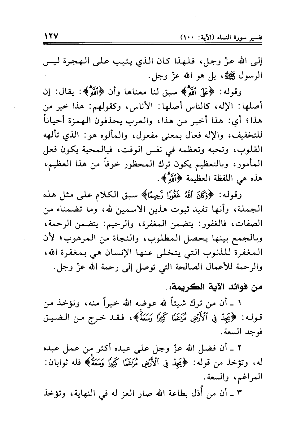 ٢ - أن فضل الله عزّ وجل على عبده أكثر من عمل عبده له، وتؤخذ من قوله: {وَيَجِدْ فِي الْأَرْضِ مُرَاغَمًا كَثِيرًا وَسَعَةً} فله ثوابان: المراغم، والسعة.