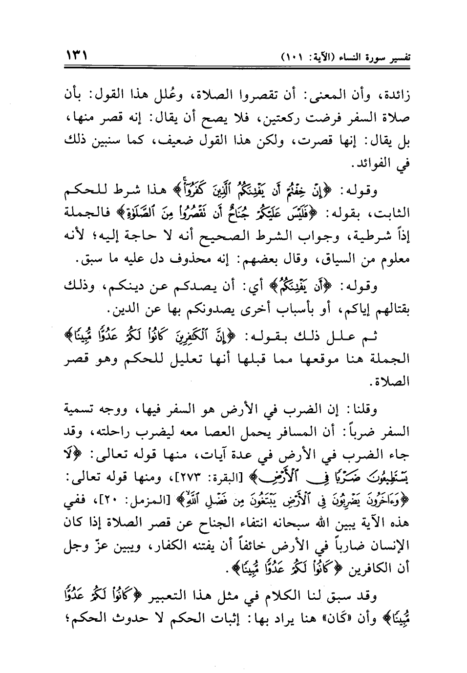 وقلنا: إن الضرب في الأرض هو السفر فيها، ووجه تسمية السفر ضربًا: أن المسافر يحمل العصا معه ليضرب راحلته، وقد جاء الضرب في الأرض في عدة آيات، منها قوله تعالى: {لَا يَسْتَطِيعُونَ ضَرْبًا فِي الْأَرْضِ} [البقرة: ٢٧٣]، ومنها قوله تعالى: {وَآخَرُونَ يَضْرِبُونَ فِي الْأَرْضِ يَبْتَغُونَ مِنْ فَضْلِ اللَّهِ} [المزمل: ٢٠]، ففي هذه الآية يبين الله سبحانه انتفاء الجناح عن قصر الصلاة إذا كان الإنسان ضاربًا في الأرض خائفًا أن يفتنه الكفار، ويبين عزّ وجل أن الكافرين {كَانُوا لَكُمْ عَدُوًّا مُبِينًا}.