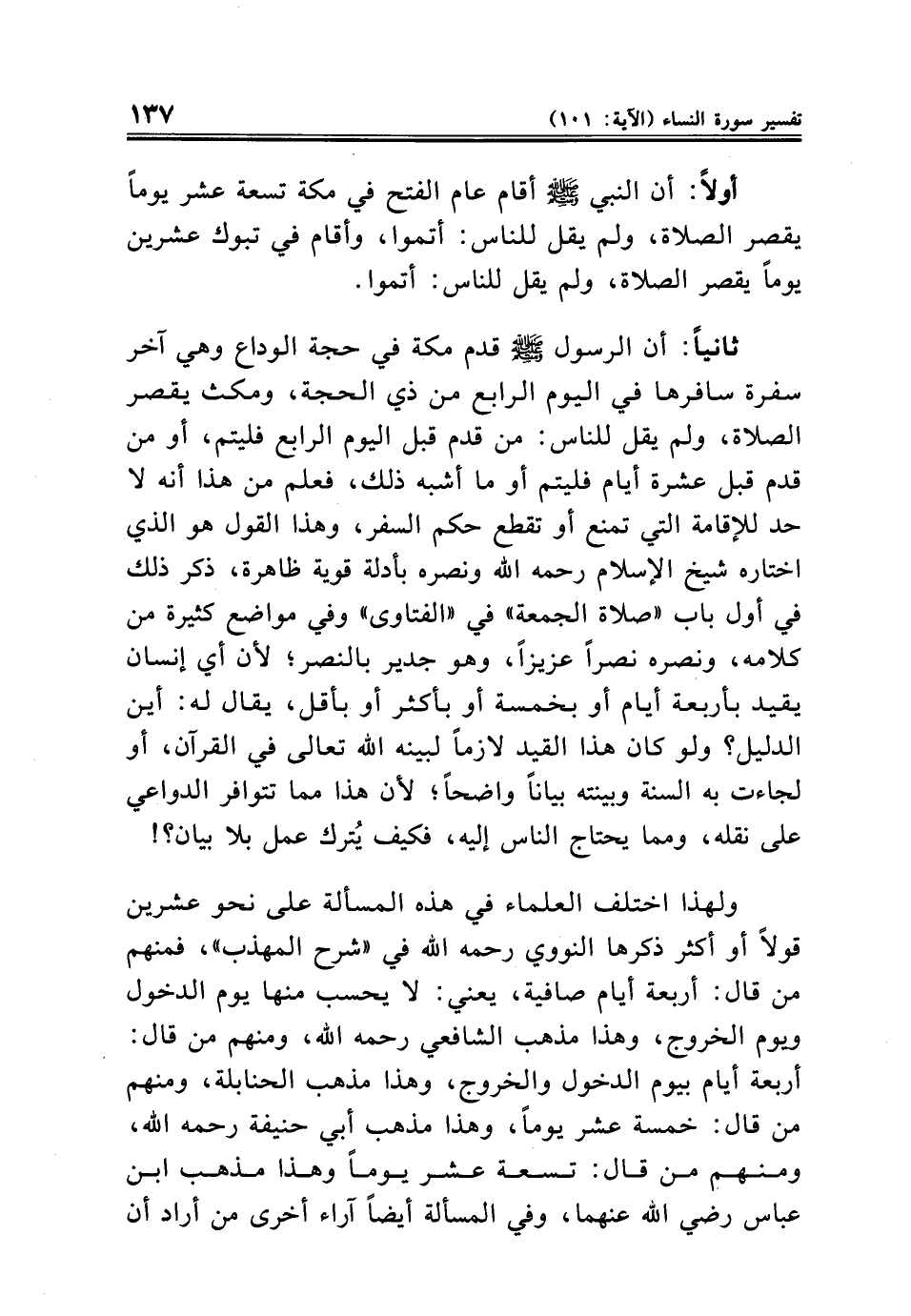 ثانيًا: أن الرسول - صلى الله عليه وسلم - قدم مكة في حجة الوداع وهي آخر سفرة سافرها في اليوم الرابع من ذي الحجة، ومكث يقصر الصلاة، ولم يقل للناس: من قدم قبل اليوم الرابع فليتم، أو من قدم قبل عشرة أيام فليتم أو ما أشبه ذلك، فعلم من هذا أنه لا حد للإقامة التي تمنع أو تقطع حكم السفر، وهذا القول هو الذي اختاره شيخ الإسلام رحمه الله ونصره بأدلة قوية ظاهرة، ذكر ذلك في أول باب "صلاة الجمعة" في "الفتاوى" وفي مواضع كثيرة من كلامه، ونصره نصرًا عزيزًا، وهو جدير بالنصر؛ لأن أي إنسان يقيد بأربعة أيام أو بخمسة أو بأكثر أو بأقل، يقال له: أين الدليل؟ ولو كان هذا القيد لازمًا لبينه الله تعالى في القرآن، أو لجاءت به السنة وبينته بيانًا واضحًا؛ لأن هذا مما تتوافر الدواعي على نقله، ومما يحتاج الناس إليه، فكيف يُترك عمل بلا بيان؟ !