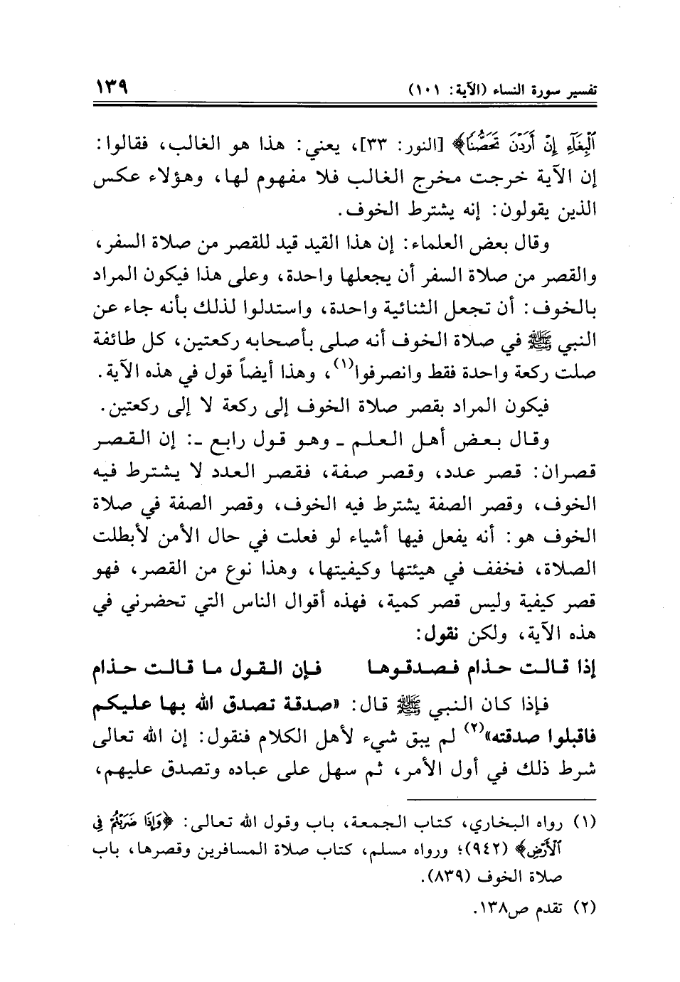 فإذا كان النبي - صلى الله عليه وسلم - قال: "صدقة تصدق الله بها عليكم فاقبلوا صدقته" (¬٢) لم يبق شيء لأهل الكلام فنقول: إن الله تعالى شرط ذلك في أول الأمر، ثم سهل على عباده وتصدق عليهم،