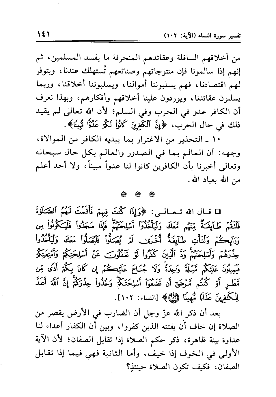 بعد أن ذكر الله عزّ وجل أن الضارب في الأرض يقصر من الصلاة إن خاف أن يفتنه الذين كفروا، وبين أن الكفار أعداء لنا عداوة بينة ظاهرة، ذكر حكم الصلاة إذا تقابل الصفان؛ لأن الآية الأولى في الخوف إذا خيف، وأما الثانية فهي فيما إذا تقابل الصفان، فكيف تكون الصلاة حينئذٍ؟