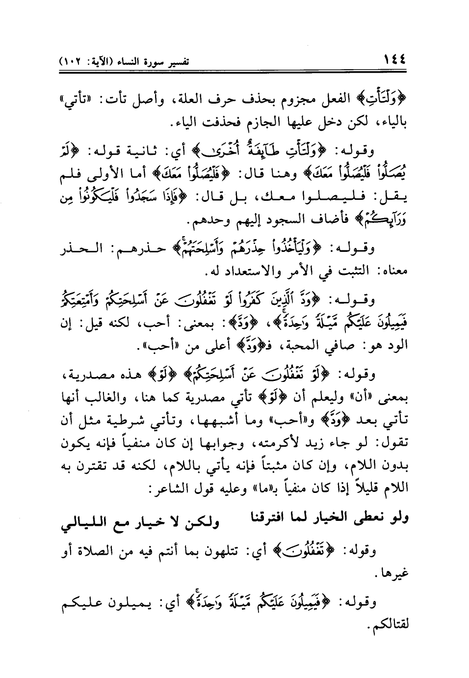وقوله: {لَوْ تَغْفُلُونَ عَنْ أَسْلِحَتِكُمْ} {لَوْ} هذه مصدرية، بمعنى "أن" وليعلم أن {لَوْ} تأتي مصدرية كما هنا، والغالب أنها تأتي بعد {وَدَّ} و"أحب" وما أشبهها، وتأتي شرطية مثل أن تقول: لو جاء زيد لأكرمته، وجوابها إن كان منفيًا فإنه يكون بدون اللام، وإن كان مثبتًا فإنه يأتي باللام، لكنه قد تقترن به اللام قليلًا إذا كان منفيًا بـ "ما" وعليه قول الشاعر: