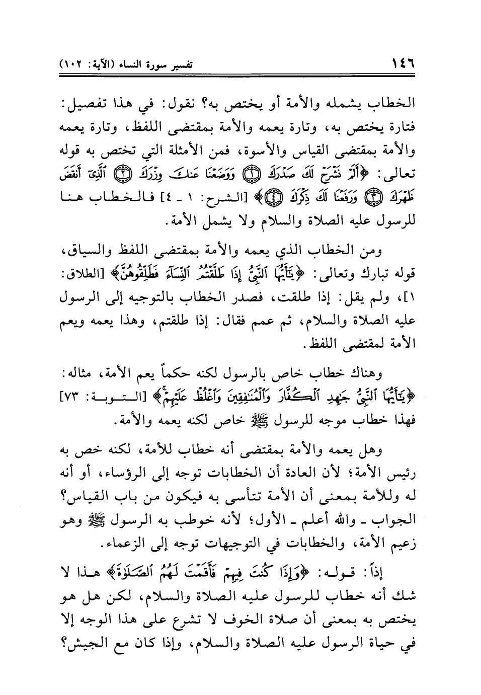 إذًا: قوله: {وَإِذَا كُنْتَ فِيهِمْ فَأَقَمْتَ لَهُمُ الصَّلَاةَ} هذا لا شك أنه خطاب للرسول عليه الصلاة والسلام، لكن هل هو يختص به بمعنى أن صلاة الخوف لا تشرع على هذا الوجه إلا في حياة الرسول عليه الصلاة والسلام، وإذا كان مع الجيش؟