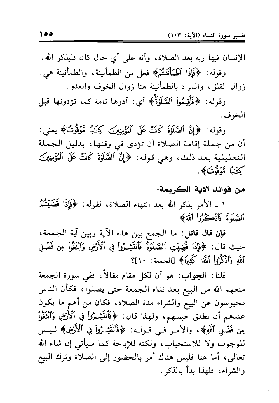 فإن قال قائل: ما الجمع بين هذه الآية وبين آية الجمعة، حيث قال: {فَإِذَا قُضِيَتِ الصَّلَاةُ فَانْتَشِرُوا فِي الْأَرْضِ وَابْتَغُوا مِنْ فَضْلِ اللَّهِ وَاذْكُرُوا اللَّهَ كَثِيرًا} [الجمعة: ١٠]؟