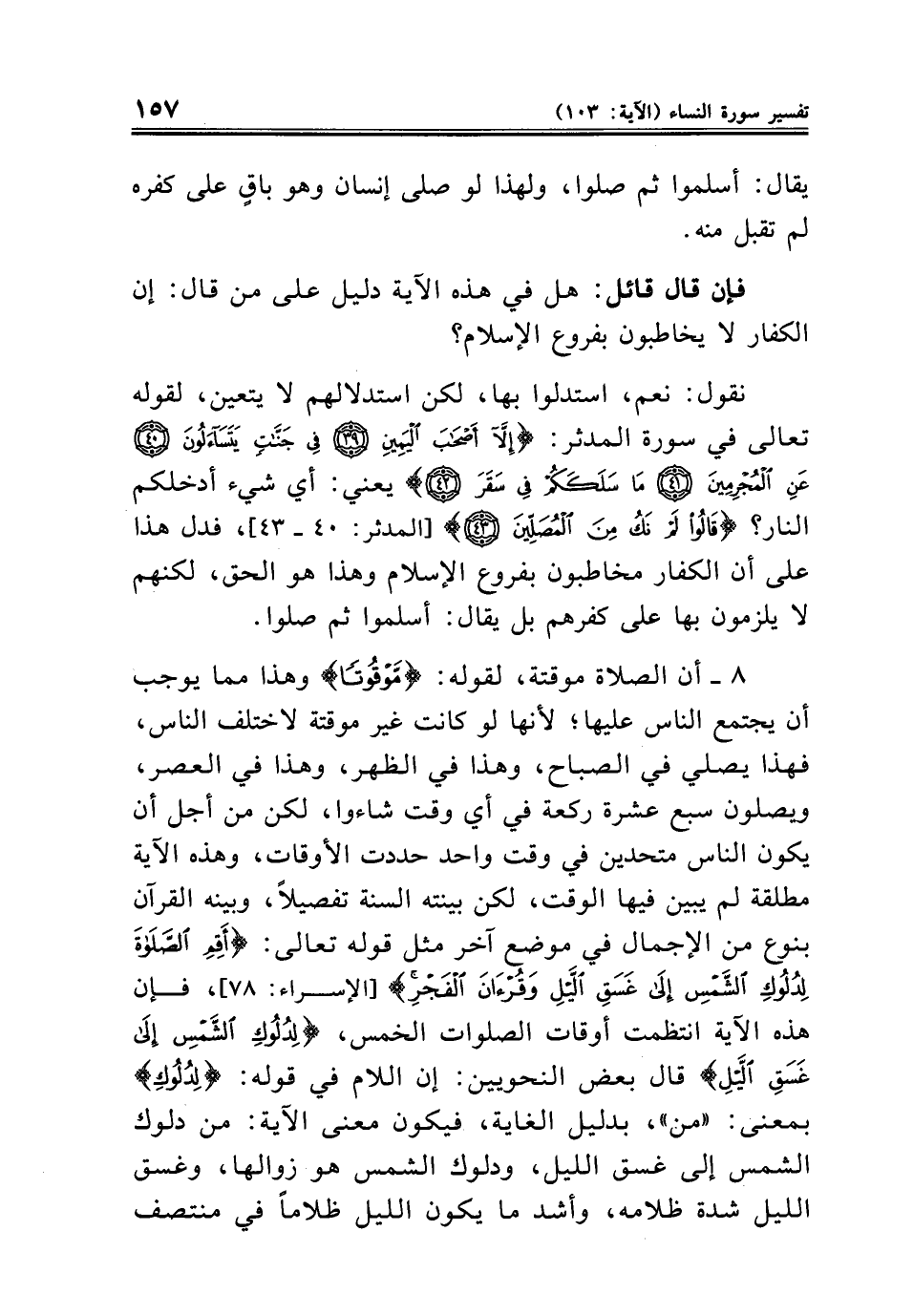 ٨ - أن الصلاة موقتة، لقوله: {مَوْقُوتًا} وهذا مما يوجب أن يجتمع الناس عليها؛ لأنها لو كانت غير موقتة لاختلف الناس، فهذا يصلي في الصباح، وهذا في الظهر، وهذا في العصر، ويصلون سبع عشرة ركعة في أي وقت شاءوا، لكن من أجل أن يكون الناس متحدين في وقت واحد حددت الأوقات، وهذه الآية مطلقة لم يبين فيها الوقت، لكن بينته السنة تفصيلًا، وبينه القرآن بنوع من الإجمال في موضع آخر مثل قوله تعالى: {أَقِمِ الصَّلَاةَ لِدُلُوكِ الشَّمْسِ إِلَى غَسَقِ اللَّيْلِ وَقُرْآنَ الْفَجْرِ} [الإسراء: ٧٨]، فإن هذه الآية انتظمت أوقات الصلوات الخمس، {لِدُلُوكِ الشَّمْسِ إِلَى غَسَقِ اللَّيْلِ} قال بعض النحويين: إن اللام في قوله: {لِدُلُوكِ} بمعنى: "من"، بدليل الغاية، فيكون معنى الآية: من دلوك الشمس إلى غسق الليل، ودلوك الشمس هو زوالها، وغسق الليل شدة ظلامه، وأشد ما يكون الليل ظلامًا في منتصف