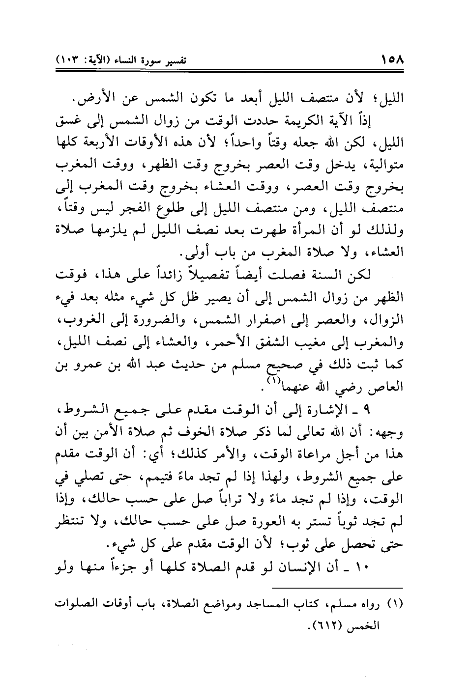 لكن السنة فصلت أيضًا تفصيلًا زائدًا على هذا، فوقت الظهر من زوال الشمس إلى أن يصير ظل كل شيء مثله بعد فيء الزوال، والعصر إلى اصفرار الشمس، والضرورة إلى الغروب، والمغرب إلى مغيب الشفق الأحمر، والعشاء إلى نصف الليل، كما ثبت ذلك في صحيح مسلم من حديث عبد الله بن عمرو بن العاص رضي الله عنهما (¬١).
