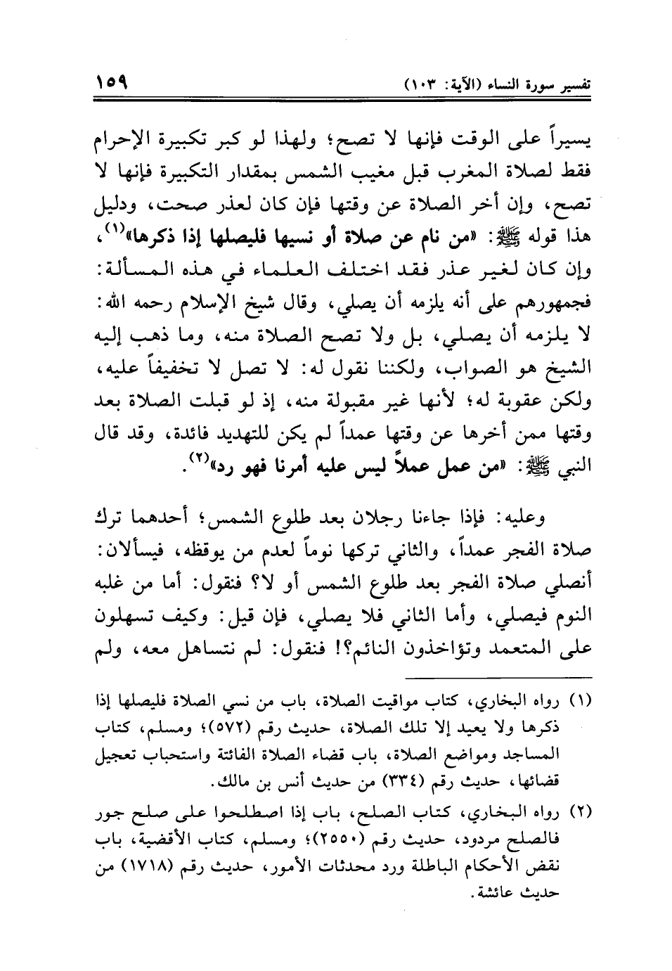 وعليه: فإذا جاءنا رجلان بعد طلوع الشمس؛ أحدهما ترك صلاة الفجر عمدًا، والثاني تركها نومًا لعدم من يوقظه، فيسألان: أنصلي صلاة الفجر بعد طلوع الشمس أو لا؟ فنقول: أما من غلبه النوم فيصلي، وأما الثاني فلا يصلي، فإن قيل: وكيف تسهلون على المتعمد وتؤاخذون النائم؟ ! فنقول: لم نتساهل معه، ولم