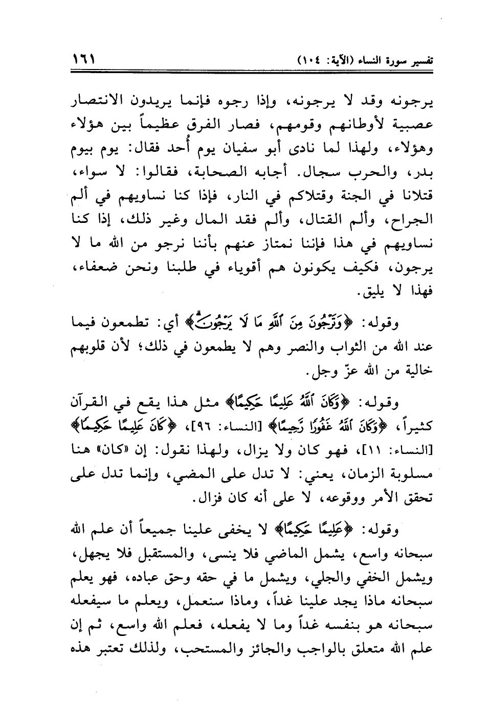 يرجونه وقد لا يرجونه، وإذا رجوه فإنما يريدون الإنتصار عصبية لأوطانهم وقومهم، فصار الفرق عظيمًا بين هؤلاء وهؤلاء، ولهذا لما نادى أبو سفيان يوم أُحد فقال: يوم بيوم بدر، والحرب سجال. أجابه الصحابة، فقالوا: لا سواء، قتلانا في الجنة وقتلاكم في النار، فإذا كنا نساويهم في ألم الجراح، وألم القتال، وألم فقد المال وغير ذلك، إذا كنا نساويهم في هذا فإننا نمتاز عنهم بأننا نرجو من الله ما لا يرجون، فكيف يكونون هم أقوياء في طلبنا ونحن ضعفاء، فهذا لا يليق.