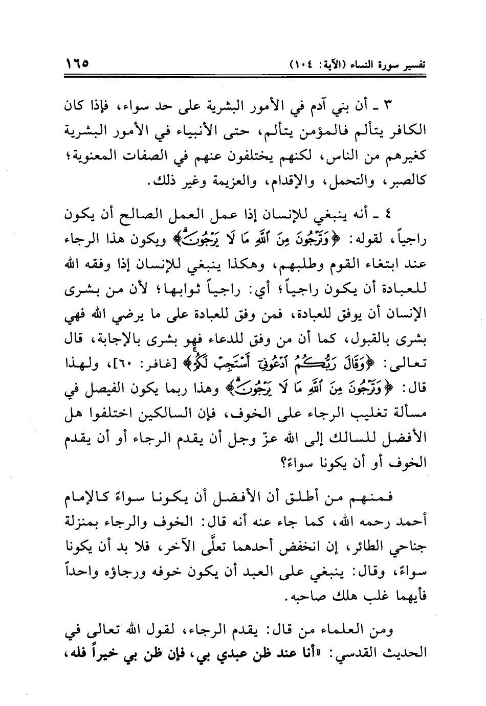 ٤ - أنه ينبغي للإنسان إذا عمل العمل الصالح أن يكون راجيًا، لقوله: {وَتَرْجُونَ مِنَ اللَّهِ مَا لَا يَرْجُونَ} ويكون هذا الرجاء عند ابتغاء القوم وطلبهم، وهكذا ينبغي للإنسان إذا وفقه الله للعبادة أن يكون راجيًا؛ أي: راجيًا ثوابها؛ لأن من بشرى الإنسان أن يوفق للعبادة، فمن وفق للعبادة على ما يرضي الله فهي بشرى بالقبول، كما أن من وفق للدعاء فهو بشرى بالإجابة، قال تعالى: {وَقَالَ رَبُّكُمُ ادْعُونِي أَسْتَجِبْ لَكُمْ} [غافر: ٦٠]، ولهذا قال: {وَتَرْجُونَ مِنَ اللَّهِ مَا لَا يَرْجُونَ} وهذا ربما يكون الفيصل في مسألة تغليب الرجاء على الخوف، فإن السالكين اختلفوا هل الأفضل للسالك إلى الله عزّ وجل أن يقدم الرجاء أو أن يقدم الخوف أو أن يكونا سواءً؟