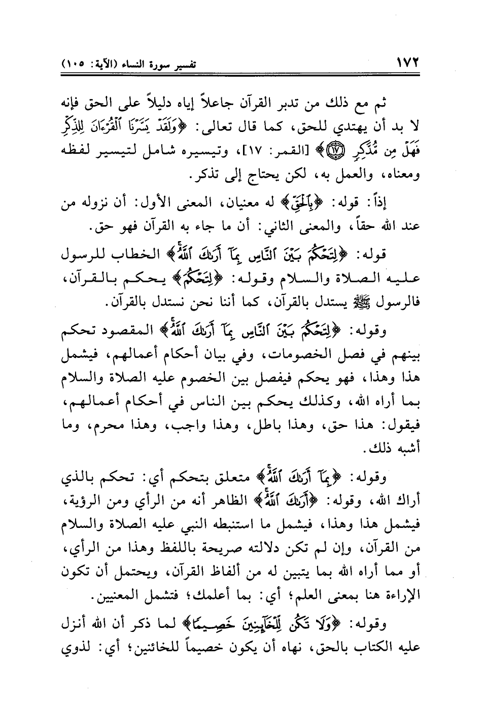 وقوله: {لِتَحْكُمَ بَيْنَ النَّاسِ بِمَا أَرَاكَ اللَّهُ} المقصود تحكم بينهم في فصل الخصومات، وفي بيان أحكام أعمالهم، فيشمل هذا وهذا، فهو يحكم فيفصل بين الخصوم عليه الصلاة والسلام بما أراه الله، وكذلك يحكم بين الناس في أحكام أعمالهم، فيقول: هذا حق، وهذا باطل، وهذا واجب، وهذا محرم، وما أشبه ذلك.