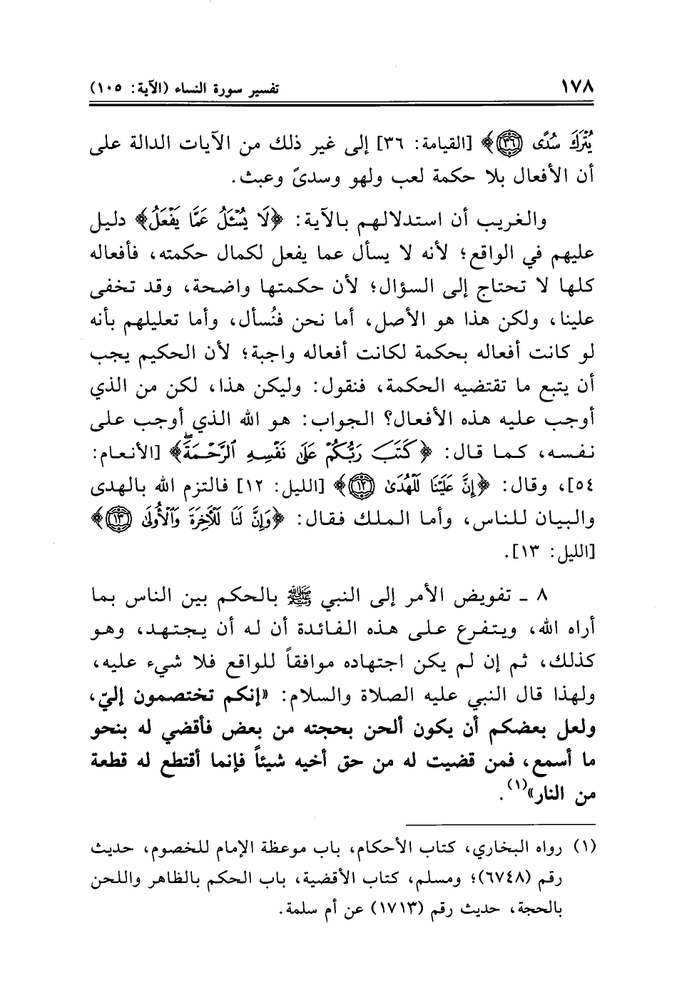 ٨ - تفويض الأمر إلى النبي - صلى الله عليه وسلم - بالحكم بين الناس بما أراه الله، ويتفرع على هذه الفائدة أن له أن يجتهد، وهو كذلك، ثم إن لم يكن اجتهاده موافقًا للواقع فلا شيء عليه، ولهذا قال النبي عليه الصلاة والسلام: "إنكم تختصمون إليّ، ولعل بعضكم أن يكون ألحن بحجته من بعض فأقضي له بنحو ما أسمع، فمن قضيت له من حق أخيه شيئًا فإنما أقتطع له قطعة من النار" (¬١).