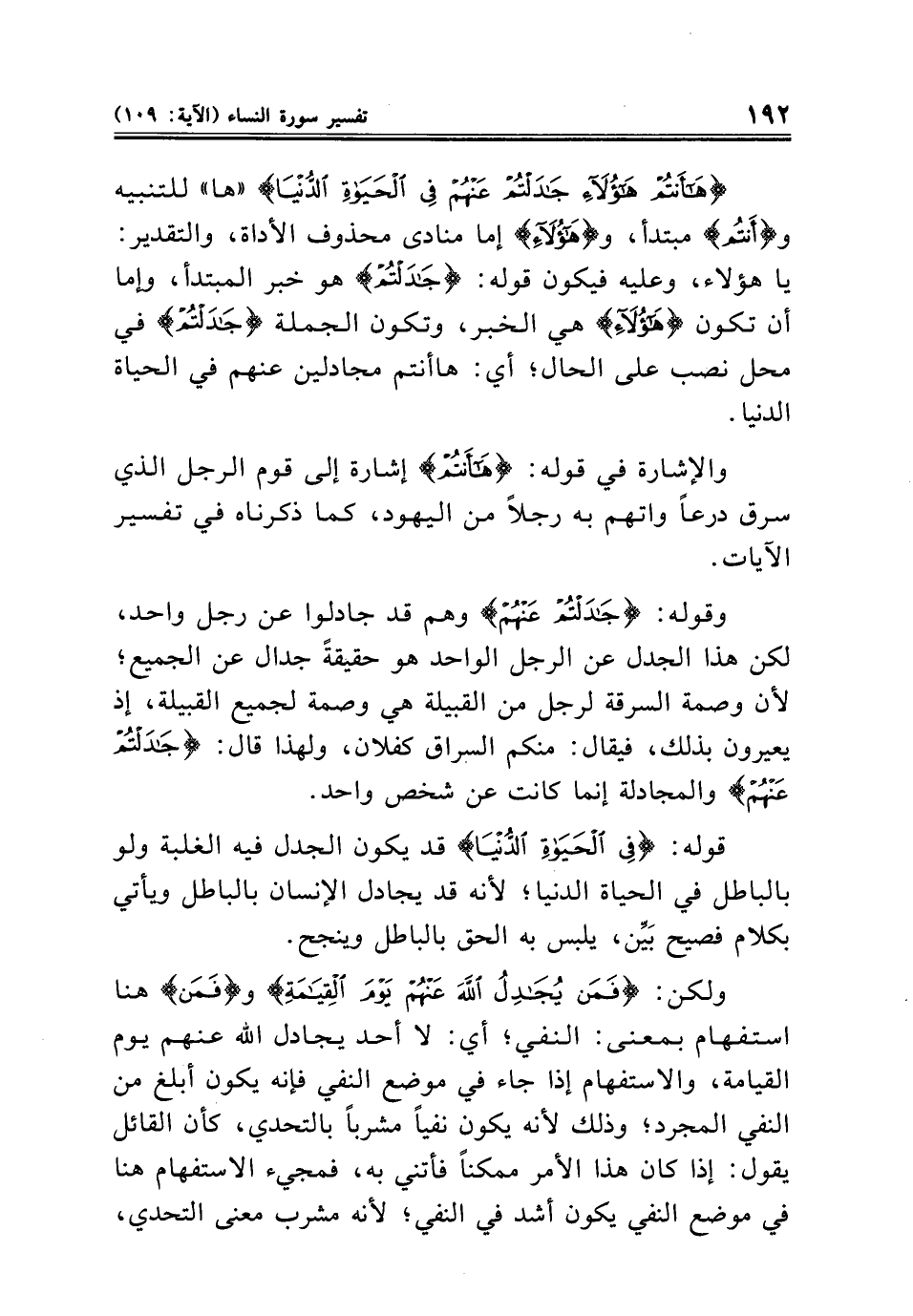 وقوله: {جَادَلْتُمْ عَنْهُمْ} وهم قد جادلوا عن رجل واحد، لكن هذا الجدل عن الرجل الواحد هو حقيقةً جدال عن الجميع؛ لأن وصمة السرقة لرجل من القبيلة هي وصمة لجميع القبيلة، إذ يعيرون بذلك، فيقال: منكم السراق كفلان، ولهذا قال: {جَادَلْتُمْ عَنْهُمْ} والمجادلة إنما كانت عن شخص واحد.
